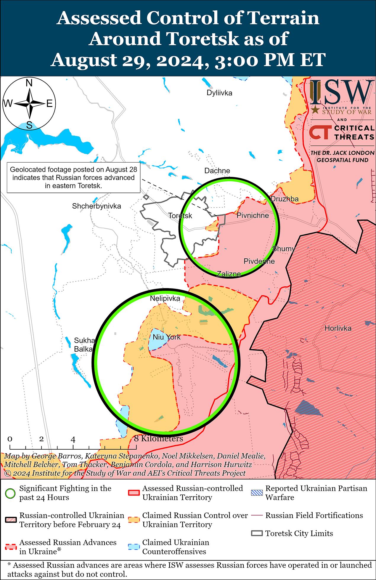 Российские войска недавно продвинулись к востоку от Торецка и, как сообщается, продвинулись дальше в восточной части Торецка 29 августа. Геолоцированные кадры, опубликованные 28 августа, указывают на то, что российские войска недавно продвинулись вдоль улицы Чапаева на северо-западе Дружбы (к востоку от Торецка). [49] Российские военные блогеры утверждали, что 29 августа российские войска продвинулись на 500 метров в восточной части Торецка, хотя ISW не зафиксировал подтверждения этому заявлению. [50] 28 и 29 августа российские войска продолжали наступательные действия вблизи Торецка, к востоку от Торецка в районе Северного и Дружбы, к югу от Торецка в районе Нью-Йорка и Нелиповки и к юго-западу от Торецка в районе Сухой Балки. [51]