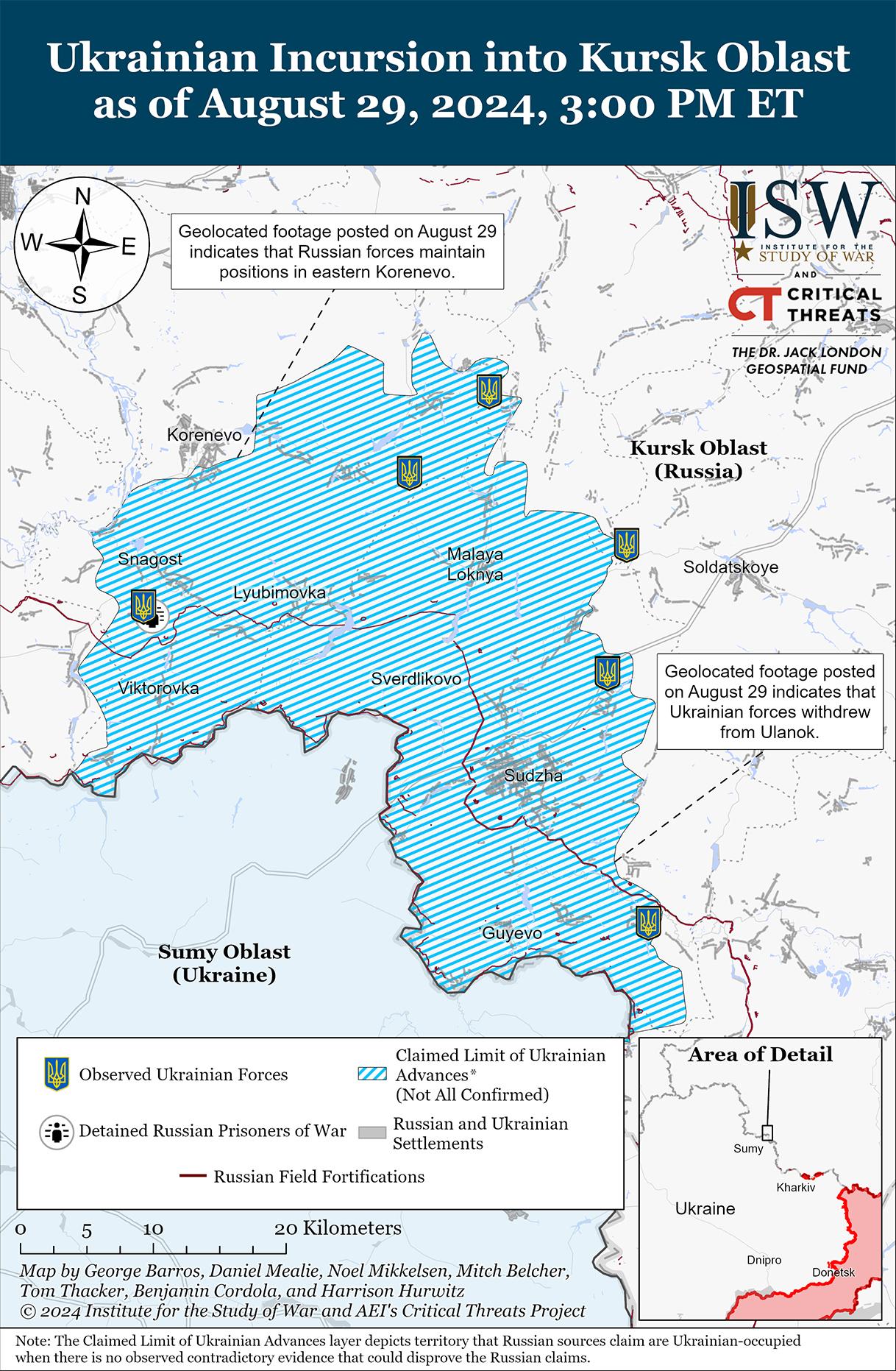 Украинские войска недавно незначительно продвинулись к северу от Суджи, когда 29 августа российские войска отбили некоторые районы Курской области. На геолоцированных кадрах, опубликованных 29 августа, видно, что украинские войска вышли к Нижней Паровой (к северу от Суджи) и продвинулись в северо-западную часть населенного пункта. [18] Дополнительные геолоцированные кадры, опубликованные 29 августа, показывают, что российские войска, вероятно, отбили Уланок (к юго-востоку от Суджи) и восточное Коренево. [19] Украинские войска продолжали наступление вблизи Коренево, Комаровки (к юго-западу от Коренево), Кремьянового (к востоку от Коренево), Любимовки (к юго-востоку от Коренево), Леонидовки (к северо-западу от Суджи), Малой Локни и Русского Поречного (оба к северу от Суджи), Мартыновки (к северо-востоку от Суджи) и в районе Борки (к юго-востоку от Суджи). [20] Российские источники утверждают, что украинские войска продолжают штурм Коренево, пытаясь проложить дорогу на Рыльск (к северо-западу от Коренево). [21] Сообщается, что подразделения российского оперативно-тактического формирования «Каскад» (ранее входило в состав Министерства внутренних дел [МВД] Донецкой Народной Республики [ДНР], по сообщениям, с тех пор подчиняется Росгвардии) ведут бои в районе Коренево, хотя, как сообщается, российское военное командование ранее распустило это соединение. [22]