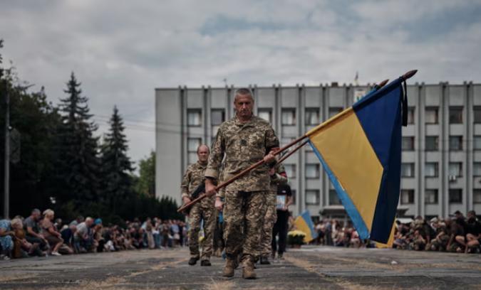 Похороны украинского пилота F-16 полковника Алексея «Лунной рыбы» Меса в Шепетовке Хмельницкой области Украины в четверг. Мес погиб, когда его F-16 разбился во время крупной российской атаки. Фото: Libkos/Getty Images