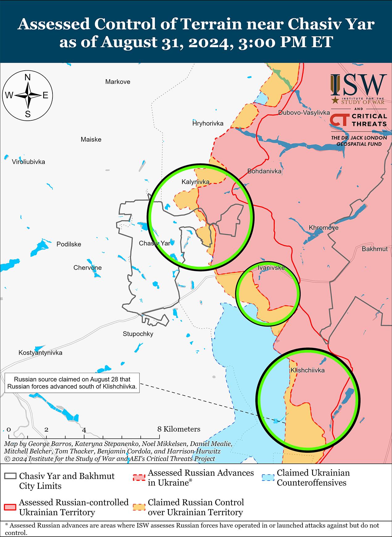 Российские войска недавно добились незначительных успехов к северу от Часова Яра на фоне продолжающихся российских наступательных операций в этом районе 31 августа. Геолоцированные кадры, опубликованные 31 августа, свидетельствуют о том, что российские войска недавно незначительно продвинулись в восточную часть Григорьевки (к северу от Часова Яра). [44] Российские войска продолжали наступательные действия в районе Часова Яра; к северу от Часова Яра в районе Калиновки; восточнее Часова Яра в районе Ивановского; южнее Часова Яра в районе Ступочки; и юго-восточнее Часова Яра в районе Андреевки, Клещеевки и Предтечного 30 и 31 августа. [45] Сообщается, что подразделения 98-й воздушно-десантной дивизии (ВДВ) продолжают действовать в районе Часова Яра. [46]