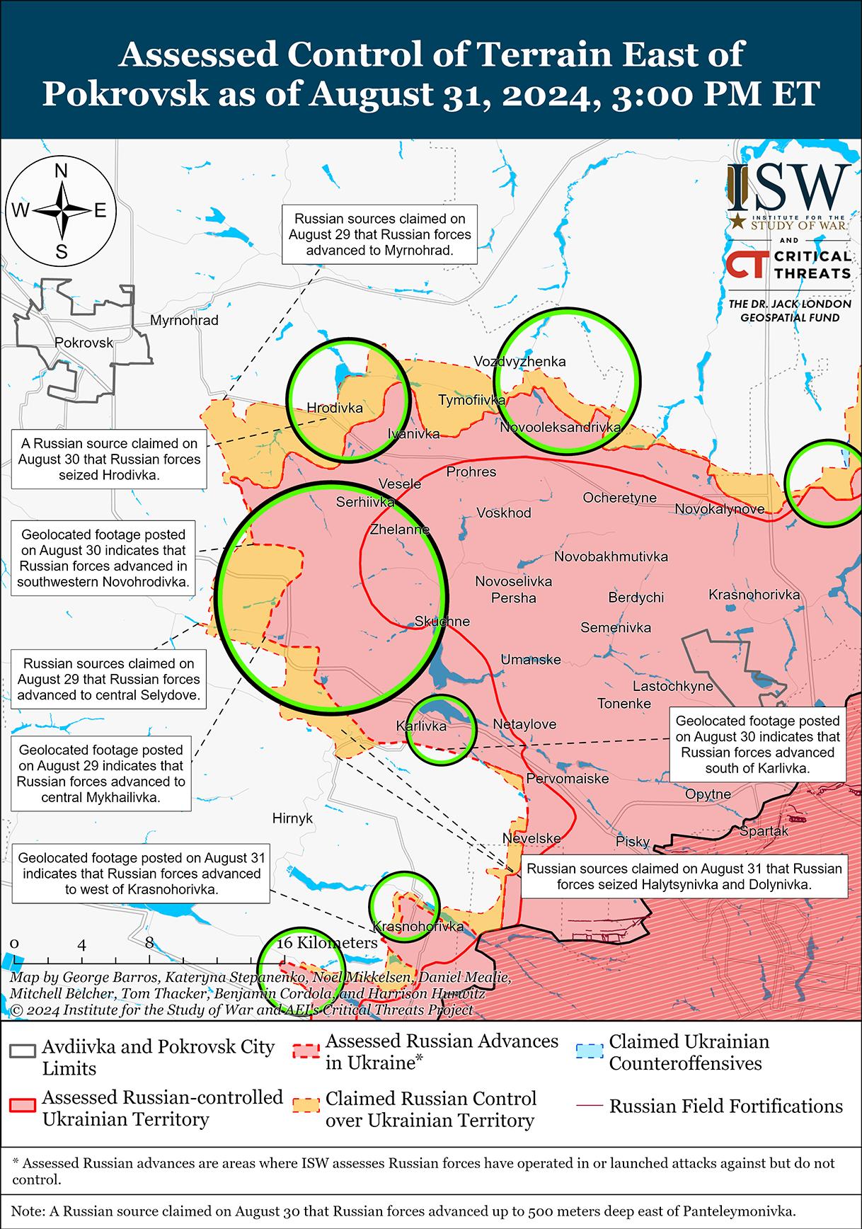 В последнее время враг продвинулся к юго-востоку от Покровска и 31 августа продолжил наступательные действия на Покровском направлении. Геолоцированные кадры, опубликованные 30 августа, указывают на то, что российские войска недавно продвинулись к югу от Карловки (к юго-востоку от Покровска) и захватили Червоноармейскую фильтровальную станцию, а геолоцированные кадры, опубликованные 31 августа, указывают на то, что российские войска недавно захватили север Галициновки (к юго-востоку от Покровска). [50] 30 и 31 августа российские источники сообщали, что части российской 114-й мотострелковой бригады (1-й АК Донецкой Народной Республики [ДНР]) продвинулись в южную часть Галициновки и полностью захватили населенный пункт, хотя ISW не зафиксировал подтверждения этих заявлений. [51] 31 августа российские военные блогеры утверждали, что российские войска, действовавшие к юго-востоку от Покровска, также захватили Долиновку (непосредственно к востоку от Галициновки), вошли в Желанное Первое (непосредственно к югу от Галициновки) и продвинулись ближе к Украинску и Лисовке (оба к западу от Галициновки). [52] Российские военные блогеры утверждают, что российские войска продолжают вести бои в восточной части Селидово (к юго-востоку от Покровска), хотя ISW пока не зафиксировал подтверждений того, что российские войска действуют в городе. [53] Российские военные блогеры утверждали, что есть сообщения о российских диверсионно-разведывательных группах, действующих вблизи окраин Мирнограда (непосредственно к востоку от Покровска) и что российская авиация наносит по городу массированные авиаудары. [54] 30 и 31 августа враг продолжил наступательные действия к востоку от Покровска в районе Воздвиженки, Гродовки и Зеленого Поля и к юго-востоку от Покровска в районах населенных пунктов Новогродовка, Мариновка, Миролюбовка, Михайловка, Селидовое, Карловка, Долиновка, Галициновка, Желанное Первое, Украинск и Лисовка. [55] Командир украинского подразделения воздушной разведки на Покровском направлении заявил в интервью The Telegraph, опубликованном 31 августа, что российские войска в этом районе имеют преимущество в живой силе пять к одному, а другой украинский солдат заявил, что российские резервы под Покровском больше, чем резервы, которые были у российских войск во время российских наступательных усилий по захвату Бахмута зимой 2022-2023 годов. [56] Командующий воздушной разведкой Украины заявил, что российские войска перебросили на Покровское направление мощные подразделения радиоэлектронной борьбы (РЭБ), заставляя украинские войска тратить больше беспилотников на удары по российской технике. [57] Сообщается, что подразделения 90-й танковой дивизии РФ (41-я ОА, ЦВО) и 27-й мотострелковой дивизии (2-я ОА, ЦВО) атакуют к юго-востоку от Селидово. [58] Сообщается, что подразделения 30-й мотострелковой бригады (2-я ОА, ЦВО) действуют в неуказанном районе Покровского направления. [59]
