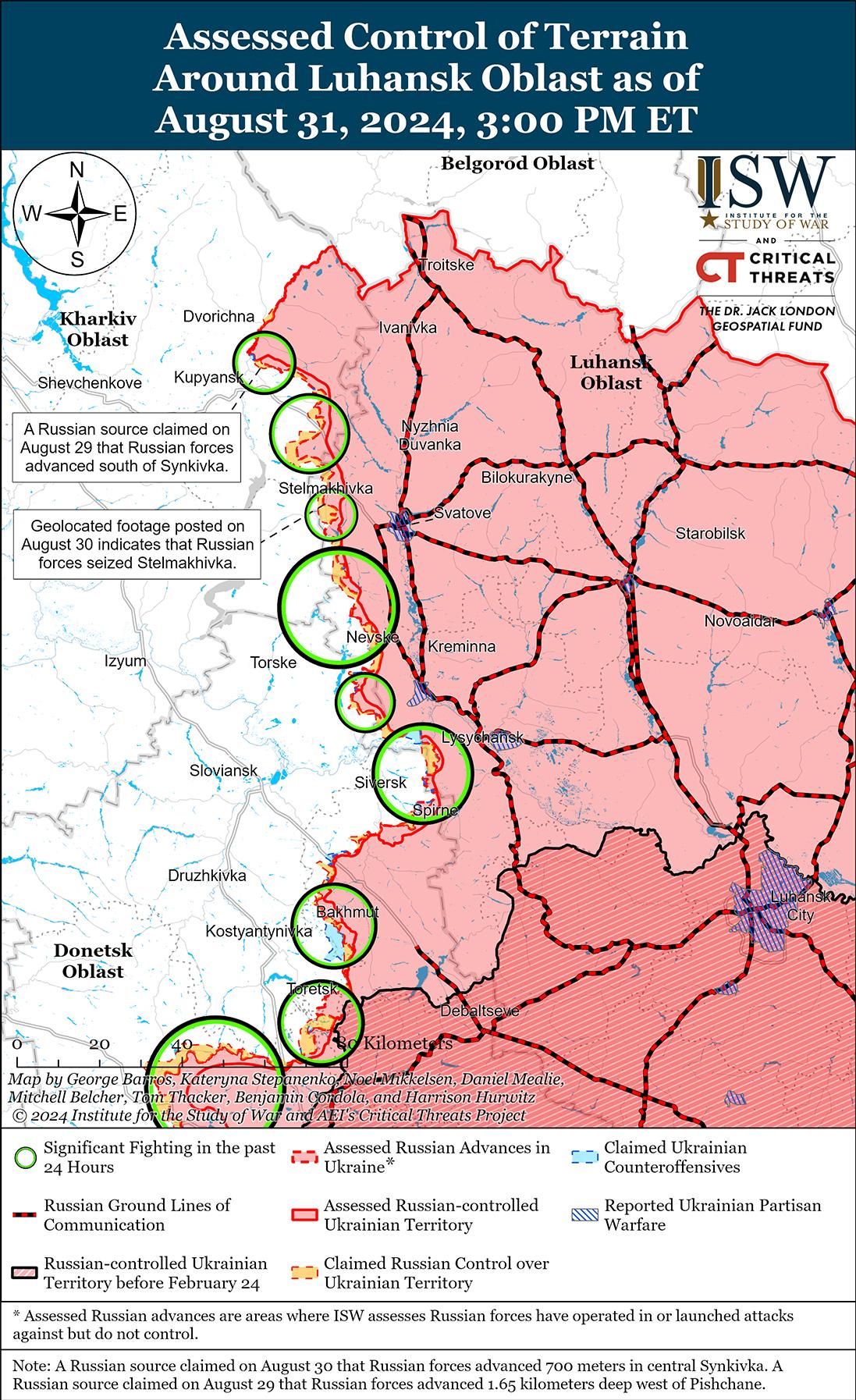Сообщается, что 31 августа российские войска продвинулись в районе Сватово на фоне продолжающихся российских наступательных операций вдоль линии Купянск-Сватово-Кременная. Российские военные блогеры утверждали, что российские войска продвинулись к югу от Песчаного (к северо-западу от Сватово), но ISW не обнаружил подтверждения этому заявлению. [38] Российские войска вели наступательные действия к северо-востоку от Купянска в районе Синьковки; юго-восточнее Купянска в районе Новоосыново и Глушковки; к северо-западу от Сватово в районе Колисинковки, Стельмаховки, Новосергиевки и в направлении Лозовой; к западу от Сватово в районе Андреевки; юго-западнее Сватово в районе Твердохлебво, Дружелюбовки и Чернещины; к северо-западу от Кременной в районах населенных пунктов Невское, Новосадово, Грековка и Макеевка; и юго-западнее Кременной в районе Дибровы и в районе Серебрянского лесничества 30 и 31 августа. [39] Российский военный блогер продолжал утверждать, что украинские войска сохраняют ограниченные позиции в Синьковке, несмотря на заявление Минобороны РФ от 30 августа о том, что российские войска захватили населенный пункт. [40] Сообщается, что подразделения 67-й мотострелковой дивизии РФ (25-я общевойсковая армия, Центральный военный округ) действуют в районе Торского (западнее Кременной). [41]