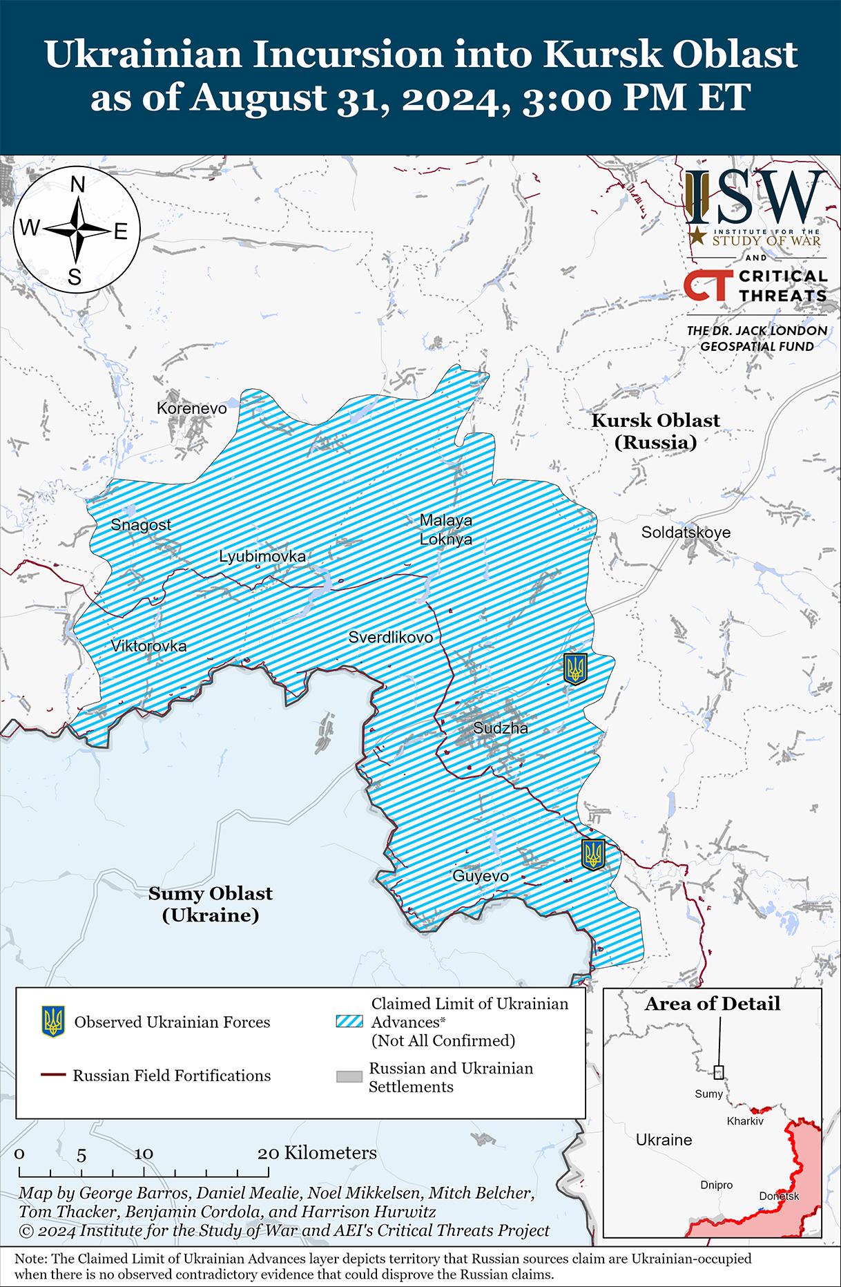 31 августа украинские войска продолжали вести штурмовые действия в Курской области, однако подтвержденных или заявленных украинских успехов не было. Российские источники утверждали, что украинские войска вели атаки к юго-западу от Коренево в районе Комаровки и Краснооктябрьского; к югу от Коренево в районе Снагоста; возле самого Коренево; к востоку от Коренево в районе Матвеевки и Кремяного; северо-западнее Суджи в районе Бахтинки и Малой Локни; севернее Суджи в районе Камышевки и Киреевки; северо-восточнее Суджи в районе Нечаева и Мартыновки; южнее Суджи у Плехово; и юго-восточнее Суджи в районе Борки и Черкасской Конопелки. [7] Отдельные российские военные блогеры утверждали, что российские войска вытеснили украинские войска из Нижней Паровой (к северо-востоку от Суджи), в то время как другой военный блогер утверждал, что населенный пункт является спорной «серой зоной». [8] Российские источники утверждали, что российские войска вернули себе 1,5 километра территории возле Коренево и вытеснили украинские войска из Нечаева. [9] Украинские беспилотные системы сообщили, что украинские беспилотные комплексы и реактивная артиллерия выполнили совместную задачу и нанесли удар по российской понтонной переправе через реку Сейм, вероятно, в Глушковском районе. [10] Сообщается, что вблизи Нечаева действуют элементы отряда «Каштан» (чеченский спецназ «Ахмат»), отряда «Арбат» (Российский добровольческий корпус), 1427-го мотострелкового полка (территориальные войска) и неназванные осетинские добровольческие формирования. [11] Сообщается, что в Курской области действуют части 810-й бригады морской пехоты (Черноморский флот), 11-й и 83-й воздушно-десантных бригад (ВДВ), 56-го полка ВДВ (7-я дивизия ВДВ) и отряда «Шир» (Российский добровольческий корпус). [12]