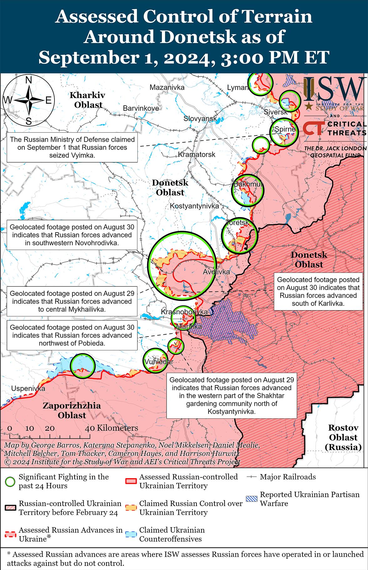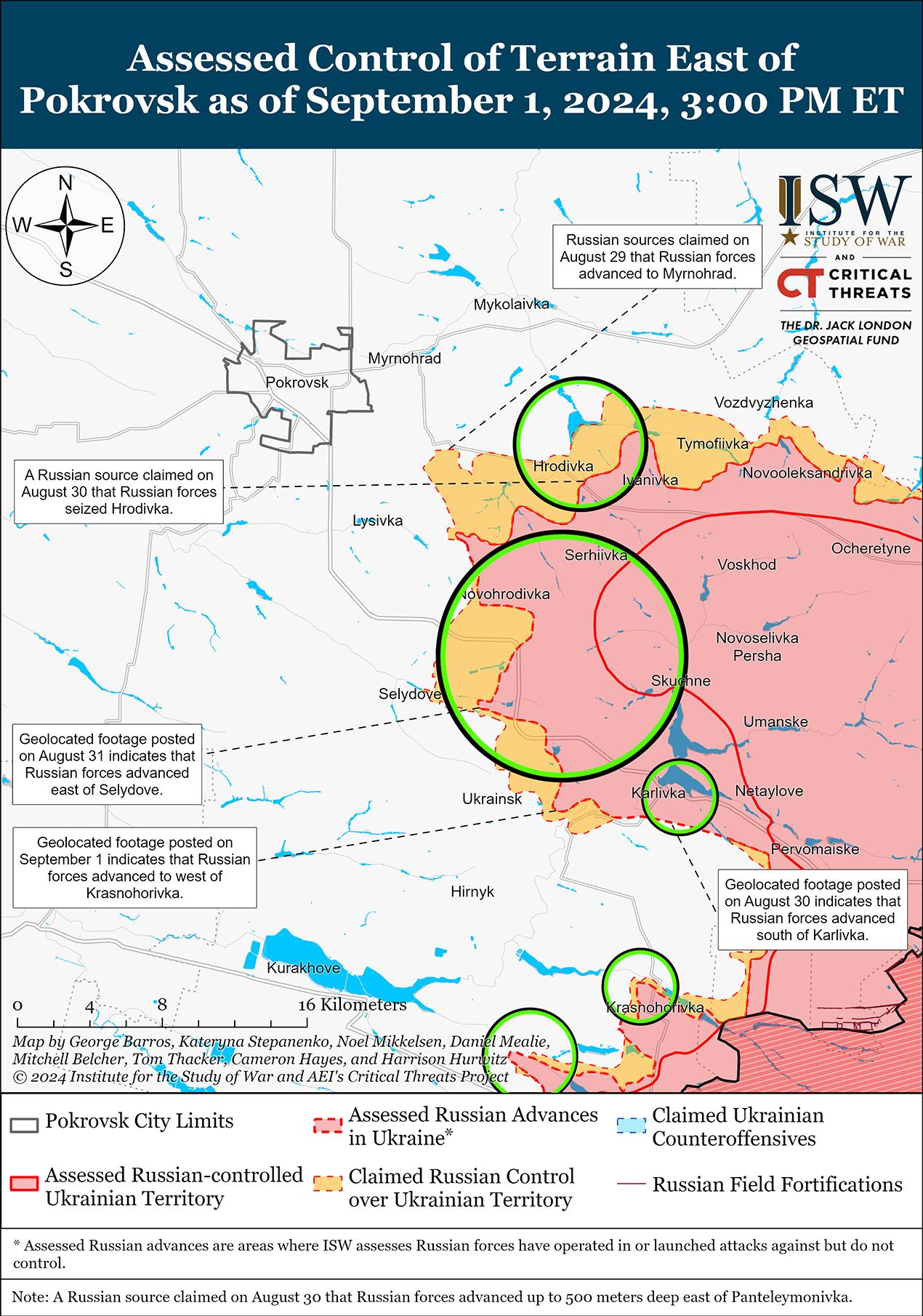 В последнее время российские войска продвинулись на Покровском направлении на фоне продолжающихся наступательных действий в этом районе 1 сентября. Геолоцированные кадры, опубликованные 1 сентября, указывают на то, что российские войска недавно продвинулись к западу от Михайловки и в центральной части Долиновки (оба к юго-востоку от Покровска), и ISW считает, что российские войска, вероятно, захватили населенные пункты. [40] ISW не зафиксировал подтверждения того, что российские войска действуют в Селидово (к юго-востоку от Покровска), несмотря на многочисленные заявления российских войск в течение последних нескольких дней о том, что российские войска продвинулись в пределах населенного пункта. [41] Министерство обороны РФ утверждало, что российские войска захватили Птиче (к юго-востоку от Покровска) 1 сентября, хотя, по оценкам ISW, российские войска захватили населенный пункт по состоянию на 22 августа. [42] Российские военные блогеры утверждали, что российские войска продвинулись к югу от Долиновки и достигли Желанного Первого (к юго-востоку от Покровска), хотя в ISW не обнаружили визуального подтверждения этих заявлений. [43] Бои продолжались к западу от Покровска в районе Гродовки, Воздвиженки, Зеленого Поля и Калиново и к юго-востоку от Покровска в районе Новогродовки, Мариновки, Михайловки, Красного Яра, Селидово и Карловки. [44] Сообщается, что подразделения российской 114-й мотострелковой бригады (1-й АК ДНР) действуют вблизи Долиновки; сообщается, что подразделения 120-й артиллерийской бригады (41-я ОА, Центральный военный округ [ЦВО]) действуют в районе Новоселовки Первой (к юго-востоку от Покровска); сообщается, что штурмовые подразделения отряда «Мора» действуют в районе Мемрика (к юго-востоку от Покровска); сообщается, что на Покровском направлении действуют подразделения 74-й мотострелковой бригады (41-я ОА, ЦВО). [45] Министр обороны России Андрей Белоусов отдал должное подразделениям 228-го мотострелкового полка РФ (90-я танковая дивизия, 41-я ОА, ЦВО) за захват Новожеланного (юго-восточнее от Покровска). [46] По оценкам ISW, по состоянию на 18 августа российские войска захватили Новожеланное. [47]