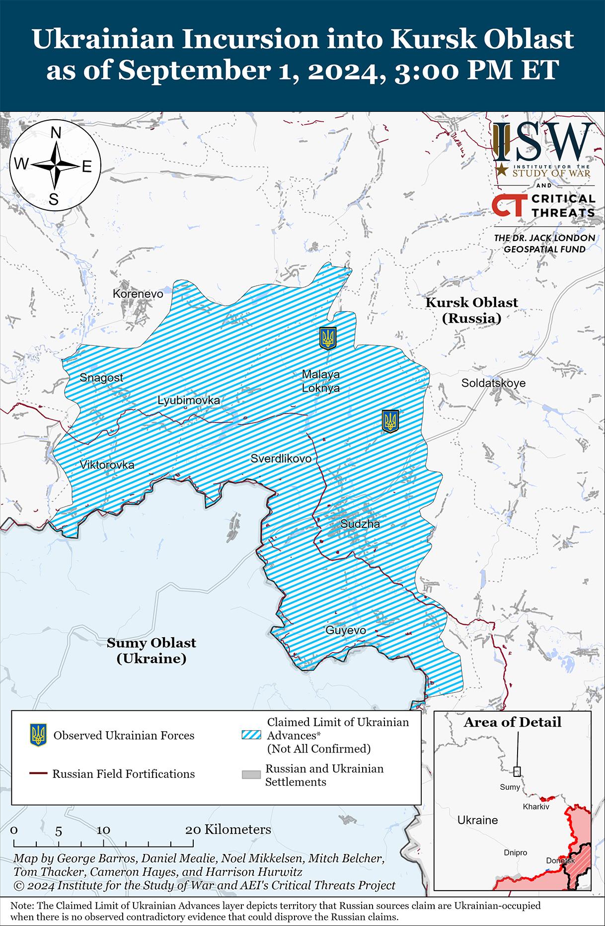 1 сентября украинские войска продолжили наступателные действия в Курской области, однако подтвержденных успехов не было. Российские источники утверждали, что украинские войска вели атаки в районе Коренево; к востоку от Коренево в районе Матвеевки; северо-восточнее Коренево в районе Александровки; северо-западнее Суджи в районе Малой Локни и Погребок; севернее Суджи в районе Камышевки; и к северо-востоку от Суджи в районе Нижней Паровой, Бахтинки и Нечаева. [9] Российский военный блогер утверждал, что украинские войска незначительно продвинулись к западу от Погребок, а геолоцированные кадры, опубликованные 1 сентября, указывают на то, что украинские войска в последнее время действовали в Погребках. [10] Другой российский военный блогер заявил, что российские войска не смогли закрепиться в Борках (к юго-востоку от Суджи) и продолжают атаковать украинские позиции в пределах населенного пункта. [11] Российский источник утверждал, что российские войска отбросили украинские войска от Коренево, очистили Комаровку (к юго-западу от Коренево) и контратаковали возле Каучука (к северо-востоку от Коренево). [12] Сообщается, что подразделения чеченского отряда спецназа «Ахмат» «Варвар» действуют в районе Черкасского Поречного (к северу от Суджи). [13] Сообщается, что в Курской области действуют подразделения 810-й бригады морской пехоты России (Черноморский флот, Южный военный округ [ЮВО]), 155-й бригады морской пехоты (Тихоокеанский флот, Восточный военный округ [ВВО]), 56-го воздушно-десантного полка (ВДВ) (7-я дивизия ВДВ) и чеченской группы спецназа «Ахмат» «Аида». [14]