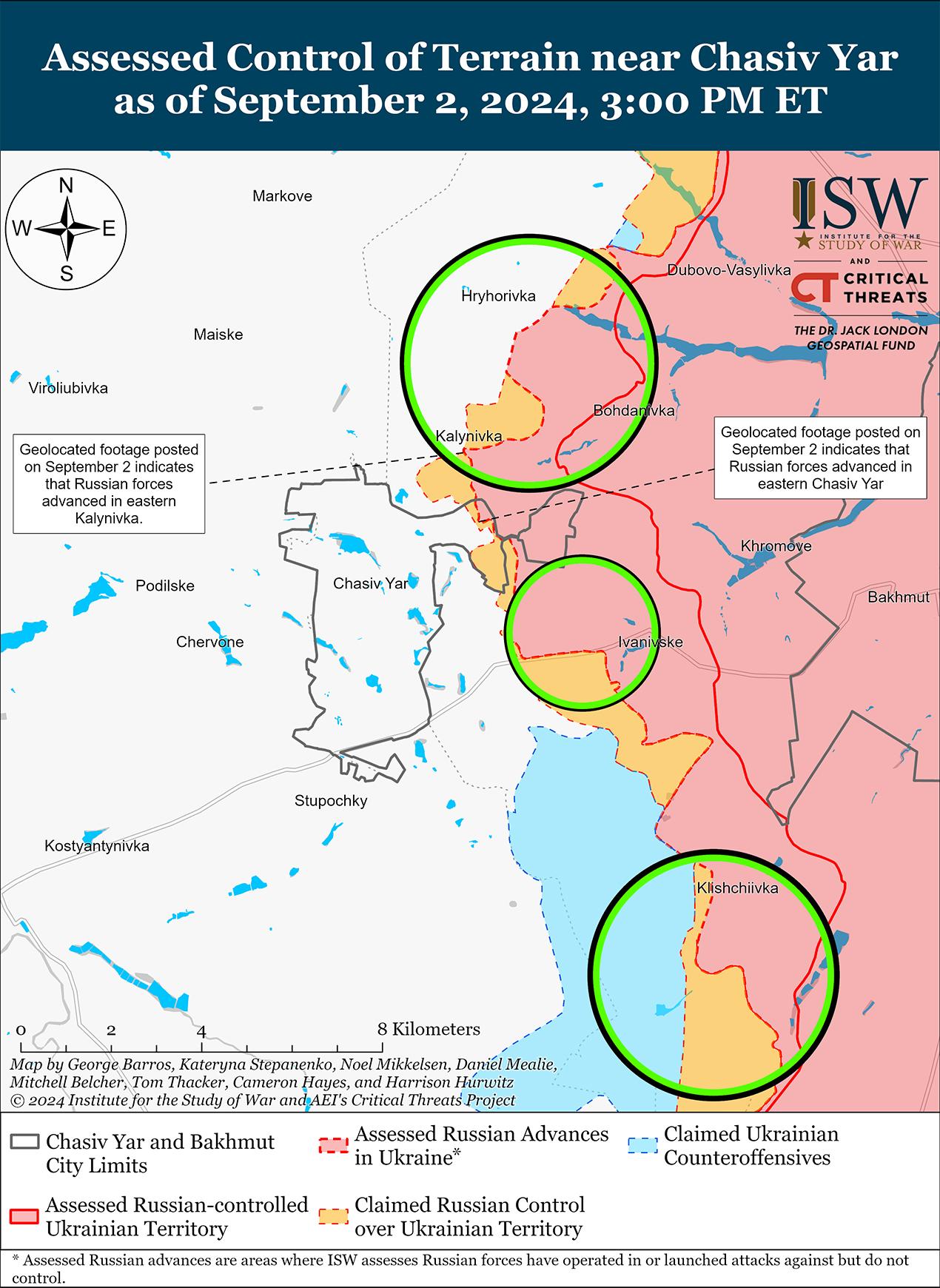 В последнее время российские войска продвинулись в районе Часова Яра на фоне продолжающихся российских наступательных действий в этом районе 2 сентября. На геолоцированных кадрах, опубликованных 1 и 2 сентября, видно, что российские войска незначительно продвинулись в микрорайоне Жовтневый (восток Часова Яра) и в восточной части Калиновки (к северу от Часова Яра). [33] Российский военный блогер утверждал, что российские войска также продвинулись на северо-восточных окраинах Калиновки (к северу от Часова Яра), однако в ISW не обнаружили визуального подтверждения этого заявления. [34] 1 и 2 сентября враг также продолжал наземные обстрелы к северу от Часова Яра в районе Майского и Марково и к юго-востоку от Часова Яра в районе Клещеевки и Андреевки. [35] Сообщается, что подразделения российской 5-й казачьей разведывательной бригады «Терек» (по сообщениям, входящей в состав добровольческого Казачьего штурмового корпуса) продолжают действовать в районе Часова Яра. [36]