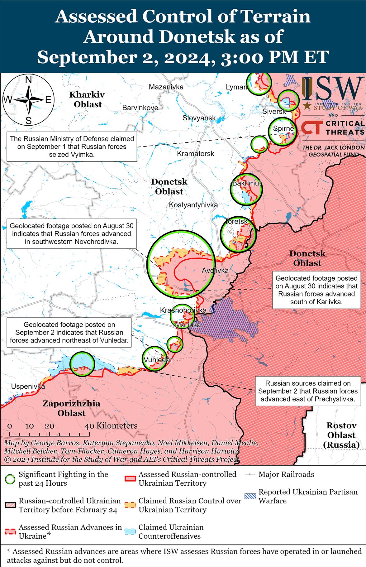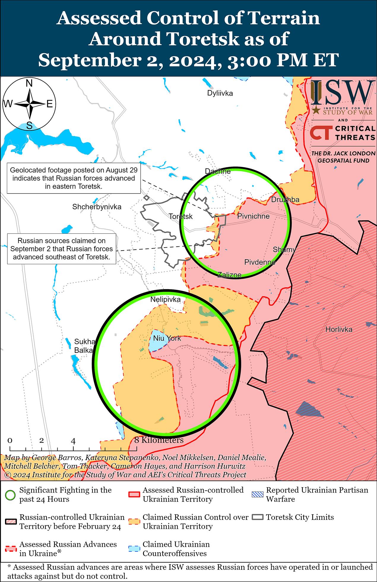 Сообщается, что 2 сентября российские войска продвинулись в Торецке на фоне продолжающихся российских наступательных операций в этом районе. Российские военные блогеры утверждают, что российские войска продвинулись на юго-восточных окраинах Торецка, хотя в ISW не обнаружили визуального подтверждения этих заявлений. [37] Бои продолжались под Торецком; к югу от Торецка в районе Нелиповки к юго-западу от Торецка в районе Романовки; и западнее Торецка в районе Щербиновки 1 и 2 сентября. [38] Министр обороны России Андрей Белоусов приписывает 132-й мотострелковой бригаде (2-й АК ЛНР) захват Северного (восточнее Торецка), и, как сообщается, подразделения бригады продолжают действовать на Торецком направлении. [39] По оценкам ISW, российские войска еще не продвинулись к северо-востоку от Северного. Глава Донецкой Народной Республики (ДНР) Денис Пушилин отдал должное российскому «сомалийскому» батальону 9-й мотострелковой бригады за захват Нью-Йорка (к югу от Торецка) и охарактеризовал 9-ю мотострелковую бригаду как подчиненную 51-й общевойсковой армии (ОА) Южного военного округа (ЮВО), поддержав недавние сообщения военных блогеров о том, что российское военное командование реорганизует 1-й АК ДНР в 51-ю ОА. [40]