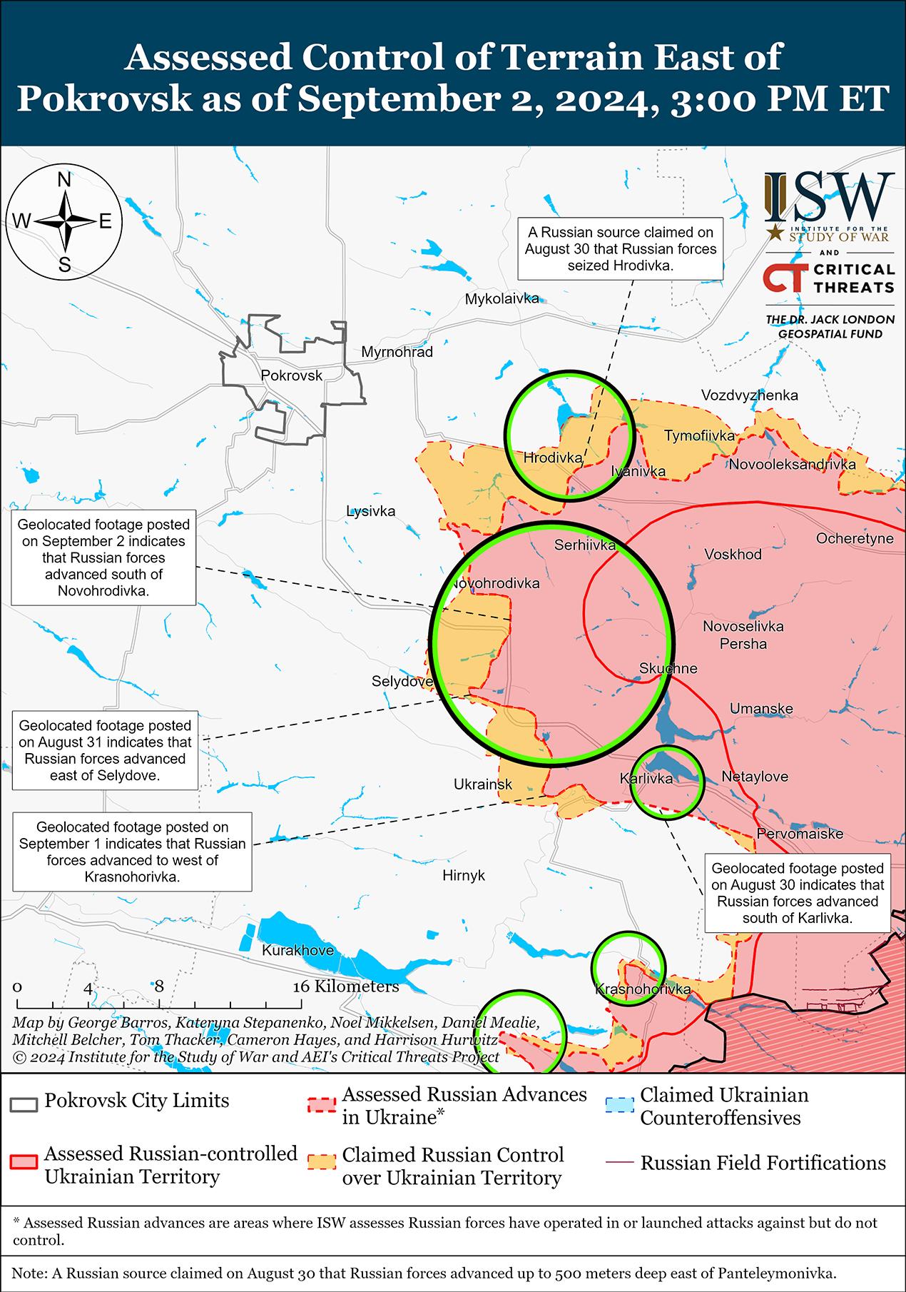 Украинские войска недавно восстановили утраченные позиции к юго-востоку от Покровска на фоне продолжающихся тактических успехов россиян в этом районе. Геолоцированные кадры, опубликованные 2 сентября, свидетельствуют о том, что украинские войска отбили позиции на юго-западе Новогродовки (к юго-востоку от Покровска), а украинский Генштаб сообщил, что российские войска на Покровском направлении в настоящее время концентрируют атаки вблизи Новогродовки. [41] Украинский военный обозреватель Константин Машовец заявил, что украинские войска продолжают удерживать Мариновку (к югу от Новогродовки), что, по оценке Машовца, препятствует продвижению российских войск на юг к Селидово (далее к юго-востоку от Покровска). [42] Глава Покровской городской администрации Сергей Добряк 2 сентября заявил, что Украина построила в Покровском районе около пяти оборонительных рубежей и что украинские силовики продолжают укреплять существующие оборонительные позиции. [43] ISW не дает возможности оценить расположение или качество этих оборонительных рубежей с целью обеспечения оперативной безопасности Украины. Дополнительные геолоцированные кадры, опубликованные 2 сентября, указывают на то, что российские войска продвинулись на северо-западе Михайловки (к востоку от Селидово и к юго-востоку от Покровска) и в полях к западу от Николаевки (к северо-востоку от Селидово и к юго-востоку от Новогродовки). [44] Российский военный блогер утверждал, что российские войска захватили Лисовку (далее к юго-востоку от Покровска и к юго-востоку от Селидово), а несколько военных блогеров утверждали, что российские войска начали атаки на Украинск (непосредственно к западу от Лисовки), хотя ISW не зафиксировал визуального подтверждения присутствия российских войск в Лисовке или Украинске. [45] Машовец заявил, что российское командование, по-видимому, балансирует между двумя противоречащими друг другу приоритетами наступления на Покровском направлении – захватом позиций на российском фланге к юго-востоку от Покровска или развитием прямого наступления на сам Покровск – и оценил, что нынешняя диспозиция российских сил в этом районе, скорее всего, не сможет поддерживать эти два приоритета наступления одновременно. [46] Сообщается, что подразделения российской 90-й танковой дивизии (41-я общевойсковая армия, Центральный военный округ) и 9-й мотострелковой бригады (51-я ОА, бывший 1-й армейский корпус Донецкой Народной Республики [АК ДНР]) действуют вдоль линии Мемрик – Лисовка (к юго-востоку от Селидово); сообщается о действиях подразделений 27-й мотострелковой дивизии (2-й ОА) и 114-й мотострелковой бригады (51-й ОА, бывший 1-й АК ДНР) вблизи Новогродовки; сообщается, что на Покровском направлении действуют беспилотные подразделения отряда спецназа «Вега» (24-я гвардейская бригада спецназа, Главное разведывательное управление Генерального штаба России [ГРУ]). [47]
