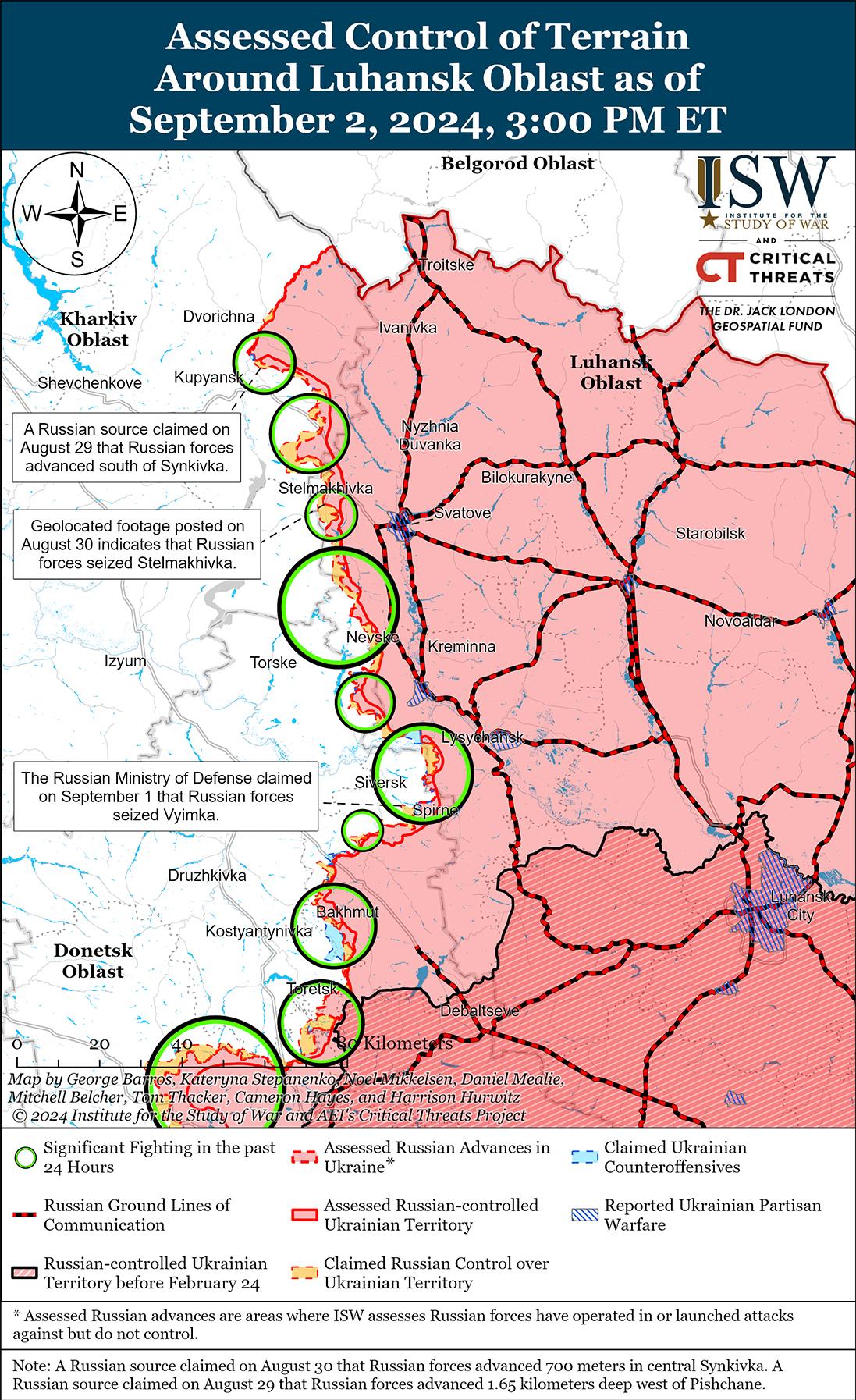 Сообщается, что 2 сентября российские войска продвинулись в районе Сватово, но подтвержденных изменений на линии фронта Купянск-Сватово-Кременная не было. Враг вел наступательные действия к северо-востоку от Купянска в районе Синьковки; восточнее Купянска в районе Петропавловки; к северо-западу от Сватово в районе Глушковки, Колесниковки, Стельмаховки и Берестового; юго-западнее Сватово в районе Дружелюбовки; к северо-западу от Кременной в районах населенных пунктов Грековка, Макеевка, Невское и Новосадово; и западнее Кременной в районе Торского 1 и 2 сентября. [26] Российский военный блогер утверждал, что российские войска продвинулись к юго-западу от Песчаного (к северо-западу от Сватово). [27] Российский источник утверждал, что российские войска зачистили южные окраины Синьковки. [28] Однако ISW не обнаружил подтверждения этих заявлений.