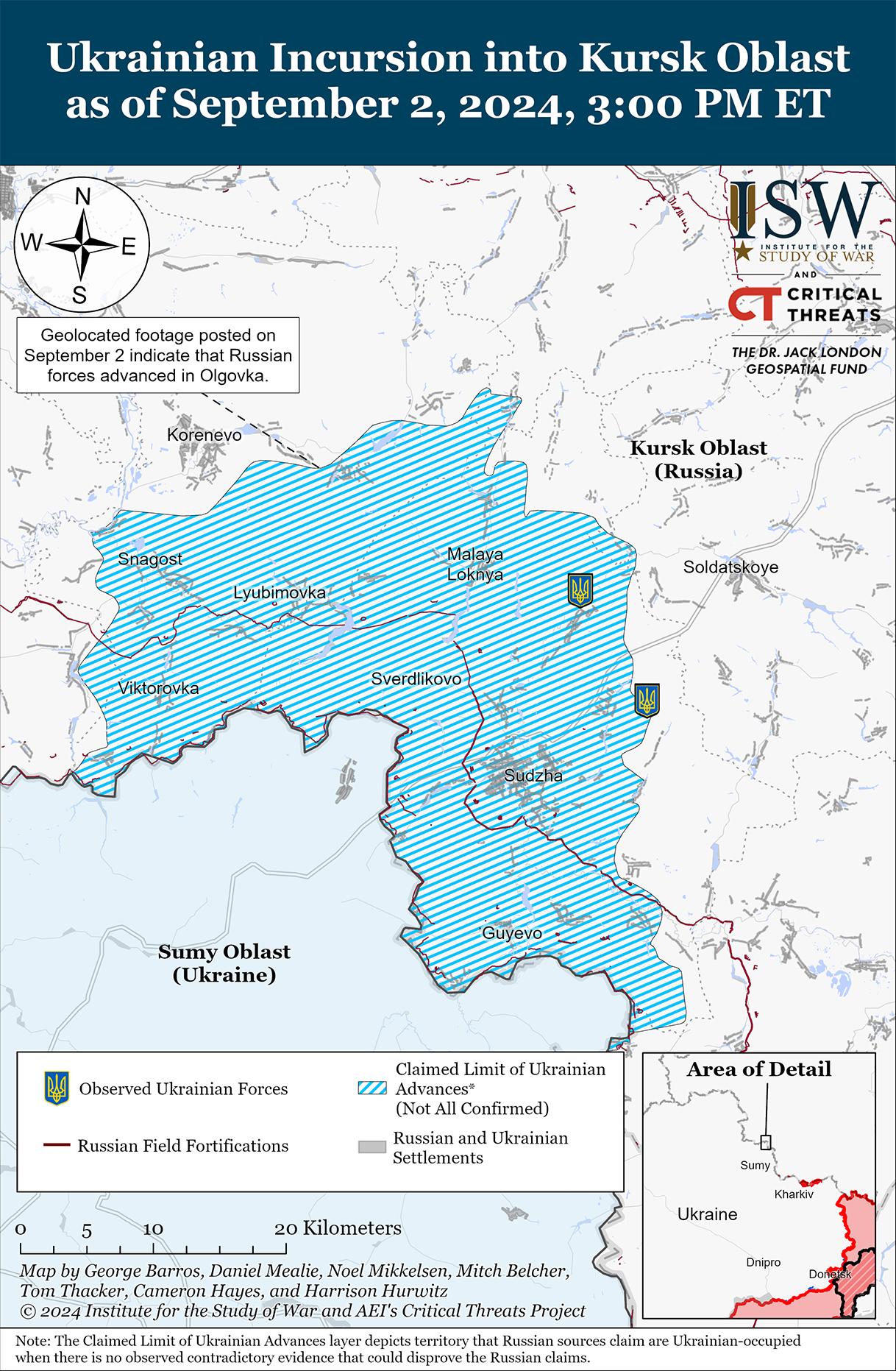 Недавно российские войска вернули утраченные позиции к востоку от Коренево на фоне продолжающихся украинских наступлений в Курской области 2 сентября. Геолоцированные кадры, опубликованные 2 сентября, указывают на то, что российские войска недавно вернули утраченные позиции в районе Ольговки (к востоку от Коренево), и ISW считает, что украинские войска, вероятно, покинули населенный пункт. [15] Российский военный блогер утверждал, что украинские войска незначительно продвинулись в районе Погребки и Малой Локни (оба к северо-западу от Суджи) и что российские войска ранее оставили позиции в этих населенных пунктах, чтобы избежать окружения. [16] Российские источники утверждали, что украинские войска вели штурмовые действия к юго-западу от Коренево в районе Комаровки; возле самого Коренево; к востоку от Коренево в районе Ольговки и Кремяного; северо-западнее Суджи в районе Малой Локни; севернее Суджи в районе Черкасского Поречного и Русского Поречного; северо-восточнее Суджи в районе Большого Солдатского и Мартыновки; и юго-восточнее Суджи в районе Борков 1 и 2 сентября. [17] Российский военный блогер заявил, что украинские войска продолжают наносить удары по российским понтонным переправам через реку Сейм в Глушковском районе (к западу от нынешнего Украинского выступа в Курской области). [18] Сообщается, что в Курской области действуют подразделения российского 30-го мотострелкового полка (72-я мотострелковая дивизия, 44-й армейский корпус, Ленинградский военный округ), 11-й воздушно-десантной бригады (ВДВ), 56-го полка ВДВ (7-я дивизия ВДВ) и чеченского спецназа «Ахмат». [19] Сообщается, что в районе Суджи действуют подразделения российской «Дивизии Донбасса». [20]