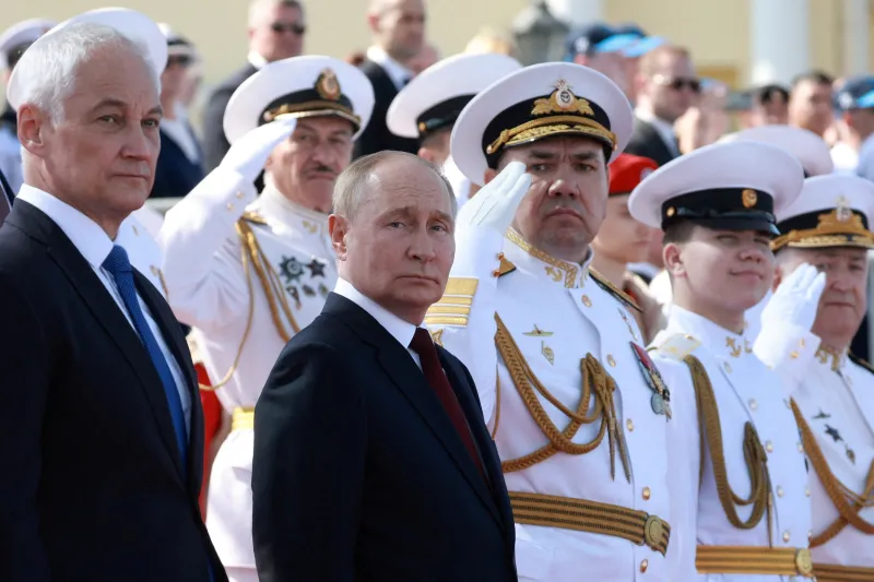Президент России Владимир Путин и члены его кабинета на военном параде в Санкт-Петербурге, июль 2024 года. Вячеслав Прокофьев/ Sputnik / Reuters
