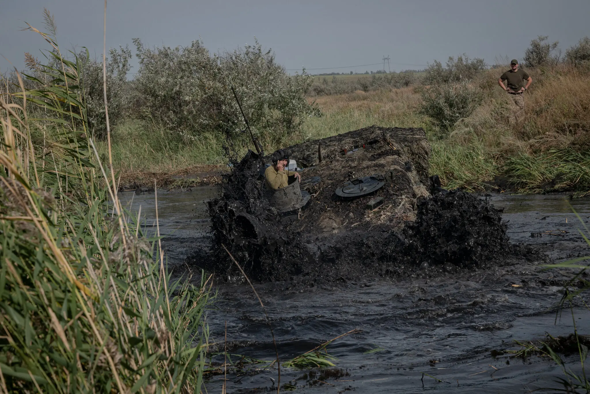 Бійці 33-ї механізованої бригади переходять річку вбрід під час навчань у Покровському районі минулого тижня. Фото…Ніколь Тунг для The New York Times