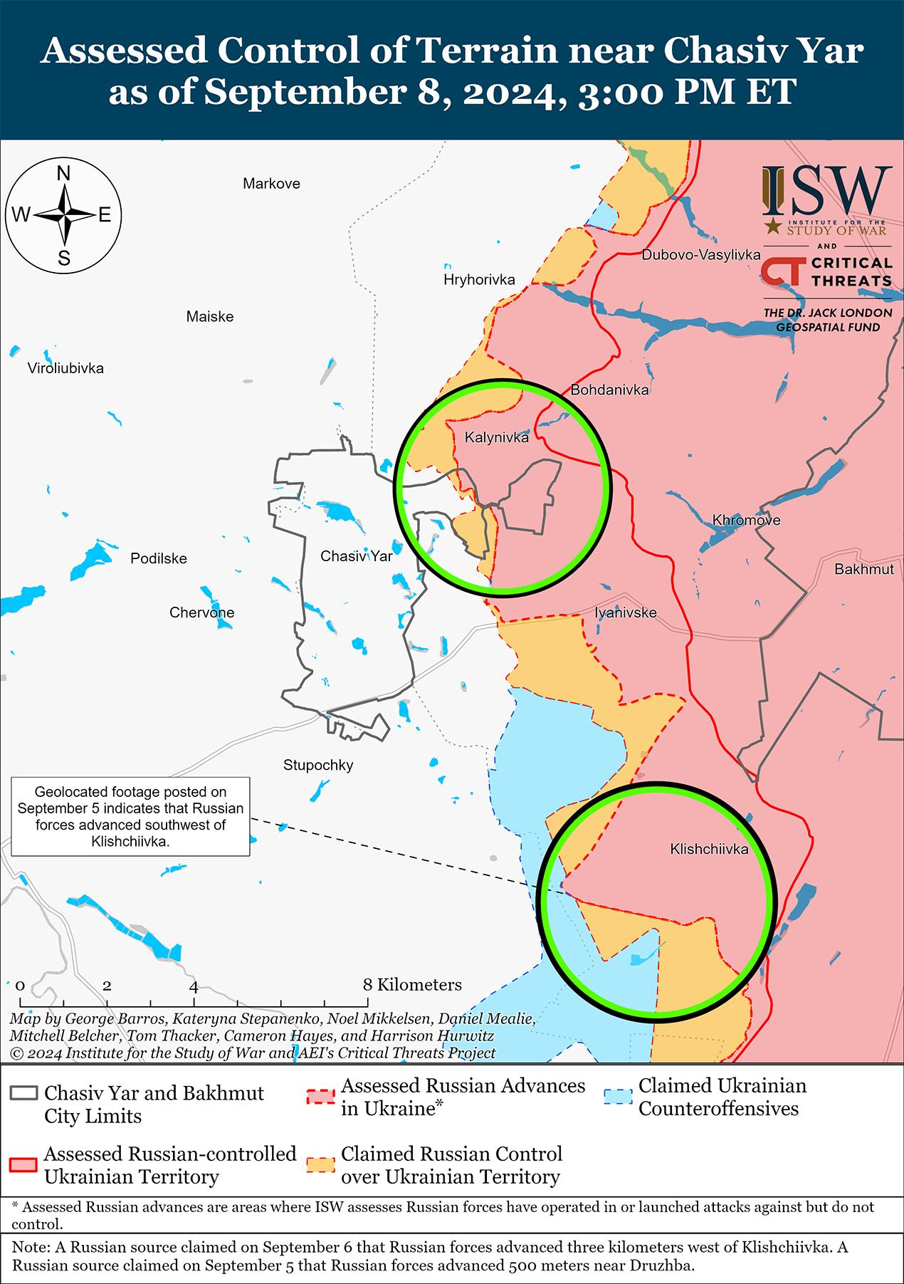 В последнее время российские войска незначительно продвинулись к северу от Часова Яра и 8 сентября продолжили наступательные действия в этом районе. Геолоцированные кадры, опубликованные 8 сентября, свидетельствуют о том, что российские войска в последнее время добились незначительных успехов на полях к северу от Калиновки (к северу от Часова Яра). [40] 7 и 8 сентября враг продолжал наступательные действия вблизи Часова Яра, к северу от Часова Яра в направлении Майского и к юго-востоку от Часова Яра в районе Андреевки и Клещеевки. [41]