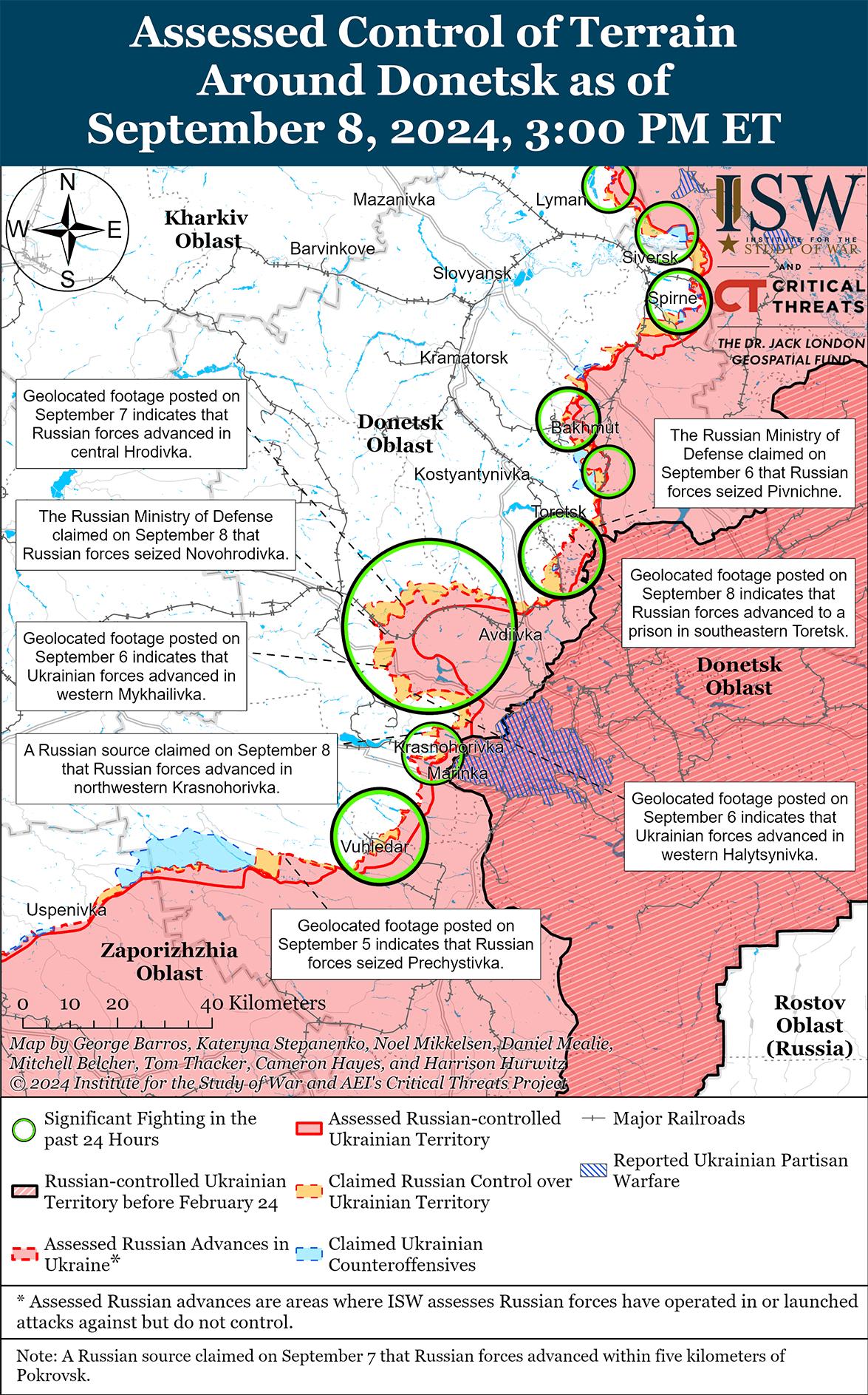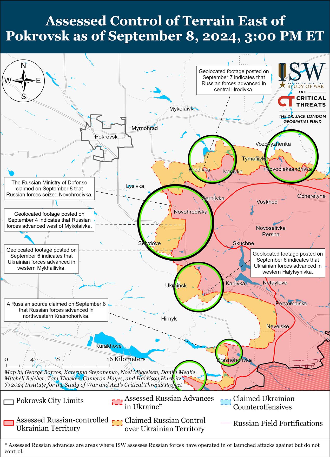 Сообщается, что российские войска продолжали продвигаться в Покровском направлении, но 8 сентября не добились подтвержденных успехов. Российский военный блогер заявил, что российские войска продвинулись ближе к Горняку (к юго-востоку от Покровска), хотя в ISW не обнаружили визуального подтверждения этого заявления. [46] Министерство обороны России утверждало, что российские войска захватили Новогродовку (к юго-востоку от Покровска), а ISW оценивал, что российские войска, вероятно, захватили город по состоянию на 2 сентября. [47] Сообщается, что российские силы безопасности сообщили кремлевскому информационному агентству ТАСС, что российские войска пытаются окружить украинские войска в Селидово (к юго-востоку от Покровска). Тем не менее, ISW еще не зафиксировал окончательных подтверждений того, что российские войска действуют в городе или продвигаются к северу или к югу от города, что может угрожать украинским силам потенциальным окружением. [48] Украинский солдат заявил, что российские войска окружили неустановленное количество раненых украинских солдат в районе Желанного Первого (к юго-востоку от Покровска), хотя ISW не обнаружил подтверждения этого сообщения или визуальных свидетельств российских успехов, которые могли бы свидетельствовать о том, что российские войска окружили какие-либо украинские позиции в этом районе. [49] 7 и 8 сентября враг продолжил наступательные действия к востоку от Покровска в районе Зеленого Поля, Воздвиженки и Гродовки, а также в направлении Новотроицкого и юго-восточнее Покровска в районах населенных пунктов Новогродовка, Селидовое, Михайловка, Долиновка, Украинск и Галициновка. [50] 7 и 8 сентября российские военные блогеры утверждали, что украинские войска продолжают контрнаступление в районе Селидово. [51] Сообщается, что в Гровке действуют подразделения 3-го мотострелкового батальона «Атлант» 35-й мотострелковой бригады (41-я общевойсковая армия, Центральный военный округ). [52] Украинский военный обозреватель Константин Машовец заявил, что Центральная группировка войск РФ завершает восстановление 1437-го мотострелкового полка (который Машовец определил как часть 41-й ОА) после того, как наступательные действия на Покровском направлении в августе 2024 года сделали полк небоеспособным, и что российское военное командование в ближайшее время вновь задействует подразделения 1437-го мотострелкового полка для участия в боевых действиях в этом районе. [53]