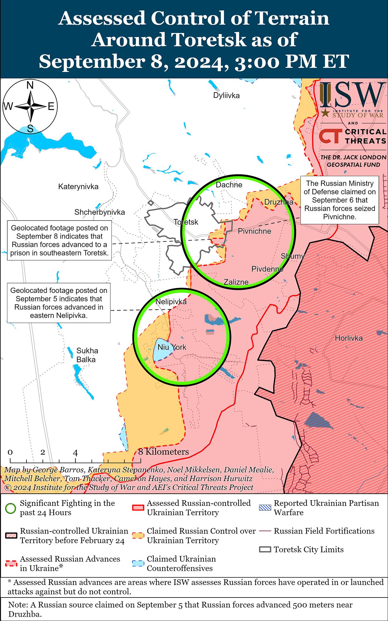 Российские войска недавно продвинулись в восточной части Торецка и 8 сентября продолжили наступательные действия в этом районе. Геолоцированные кадры, опубликованные 8 сентября, указывают на то, что российские войска недавно продвинулись в восточной части Торецка. [42] 7 и 8 сентября российские войска продолжили наступательные действия вблизи Торецка, к югу от Торецка в районе Нелиповки и к юго-западу от Торецка в районе Сухой Балки. [43] Российские военные блогеры утверждали, что 8 сентября украинские войска продолжили контратаки в Нью-Йорке (к югу от Торецка) и 7 сентября продвинулись в центральную часть Нью-Йорка. [44] ISW наблюдал геолоцированные кадры недавних контратак украинских войск на северо-западе Нью-Йорка и удержания позиций в населенном пункте, но пока не обнаружил визуальных подтверждений того, что украинские войска недавно вернули себе дополнительные территории в Нью-Йорке. [45]