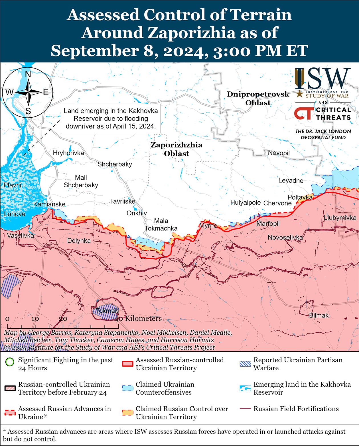 8 сентября на западе Запорожской области продолжались позиционные бои, но подтвержденных изменений на линии фронта не было. Российские военные блогеры утверждают, что российские войска продвинулись в Работино и захватили два опорных пункта к западу от Новопрокоповки (к северо-востоку от Работино), хотя в ISW не обнаружили визуальных доказательств этих заявлений. [59] 8 сентября бои продолжались в районе Работино и Малой Токмачки (северо-восточнее Работино). [60]