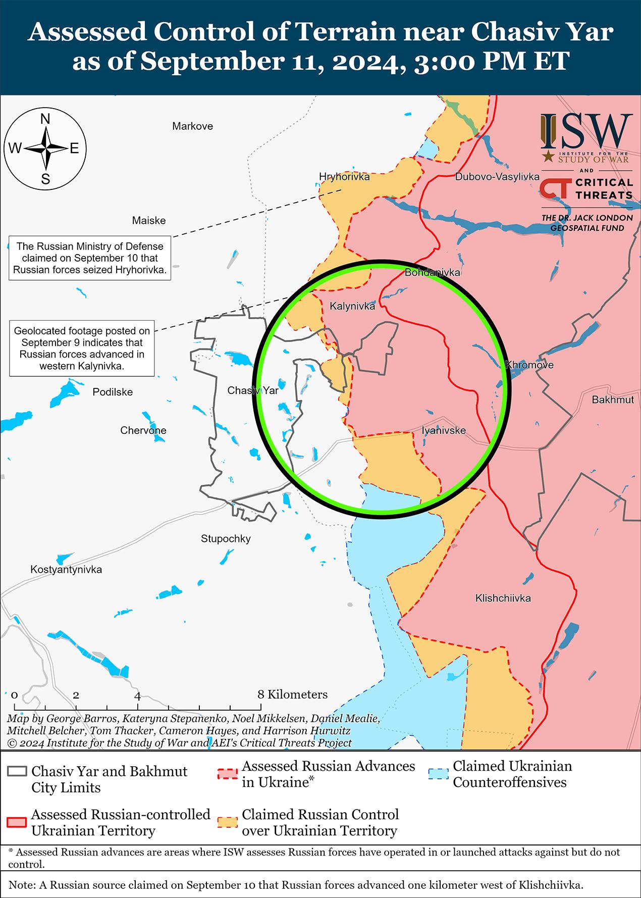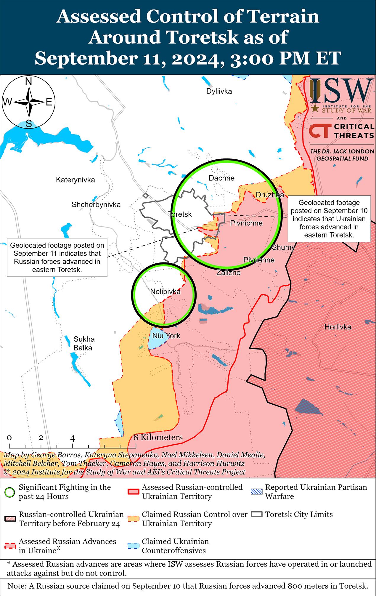 Как российские, так и украинские войска недавно незначительно продвинулись под Торецком на фоне продолжающихся боев в этом районе 11 сентября. Геолоцированные кадры, опубликованные 10 сентября, указывают на то, что украинские войска в последнее время незначительно продвинулись в северо-восточной части Торецка. [40] Дополнительные геолоцированные кадры, опубликованные 11 сентября, указывают на то, что российские войска продвинулись вдоль улицы Центральной в восточной части Торецка, а российский военный блогер утверждал, что российские войска продвинулись дальше по этой улице и в полях к юго-востоку от Торецка. [41] Однако ISW не наблюдал визуального подтверждения этих более обширных заявлений. 10 и 11 сентября российские войска также продолжили наземные атаки вблизи Дачного (к северо-востоку от Торецка), Северного (к востоку от Торецка) и Нелиповки (к югу от Торецка). [42]