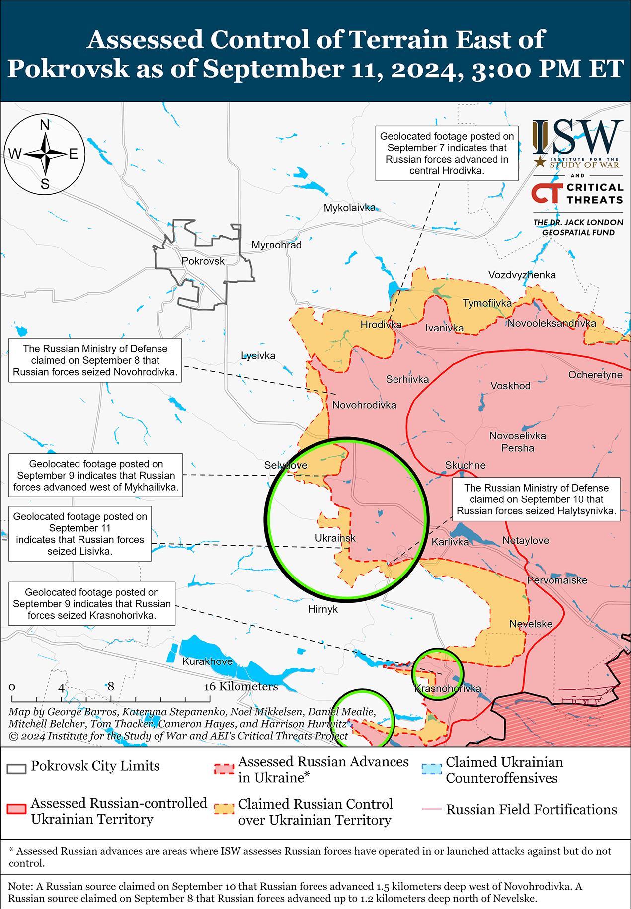 Спикер Харьковской группировки войск полковник Виталий Саранцев 11 сентября сообщил, что российские войска пополняют свои тактические, оперативные и стратегические резервы. [63] Саранцев не сообщил подробностей о численности этих резервов, но заявил, что российские военные уделяют особое внимание всесторонней подготовке новых военнослужащих. Ранее ISW наблюдал сообщения о том, что с октября 2023 года по июнь 2024 года российские войска накопили не более 60 000 военнослужащих в оперативных и стратегических резервах, что достаточно для создания лишь ограниченных оперативных и стратегических резервов. [64] ISW продолжает считать, что российские военные, вероятно, используют эти резервы в качестве резервов живой силы для пополнения и усиления передовых подразделений, которые ведут изнурительные атаки с большим количеством пехоты и иногда ограниченными механизированными атаками, и сдерживают свои оставшиеся оперативные резервы для захвата самого города Покровска. [65]