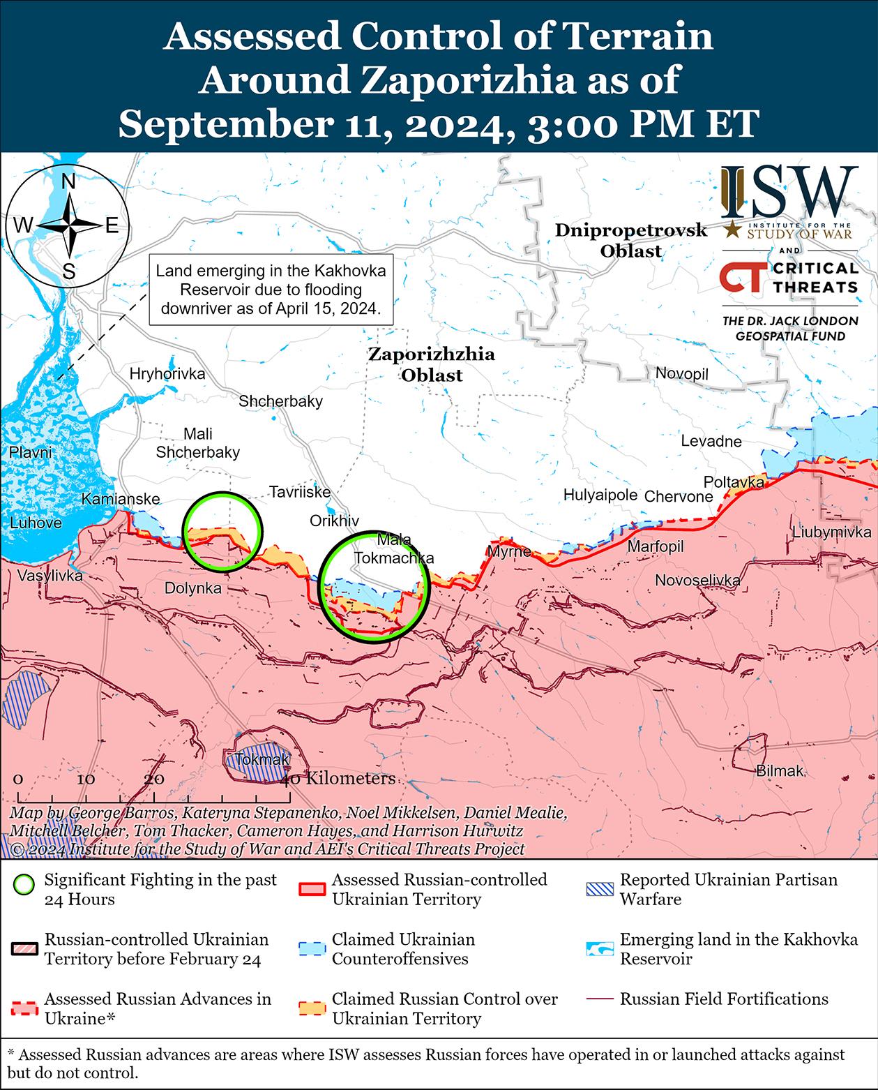 10 и 11 сентября враг продолжил штурмовые действия на западе Запорожской области, в том числе к северо-западу от Работино возле Малых Щербаков и к северо-востоку от Работино возле Малой Токмачки, но изменений на линии фронта не произошло. [56]