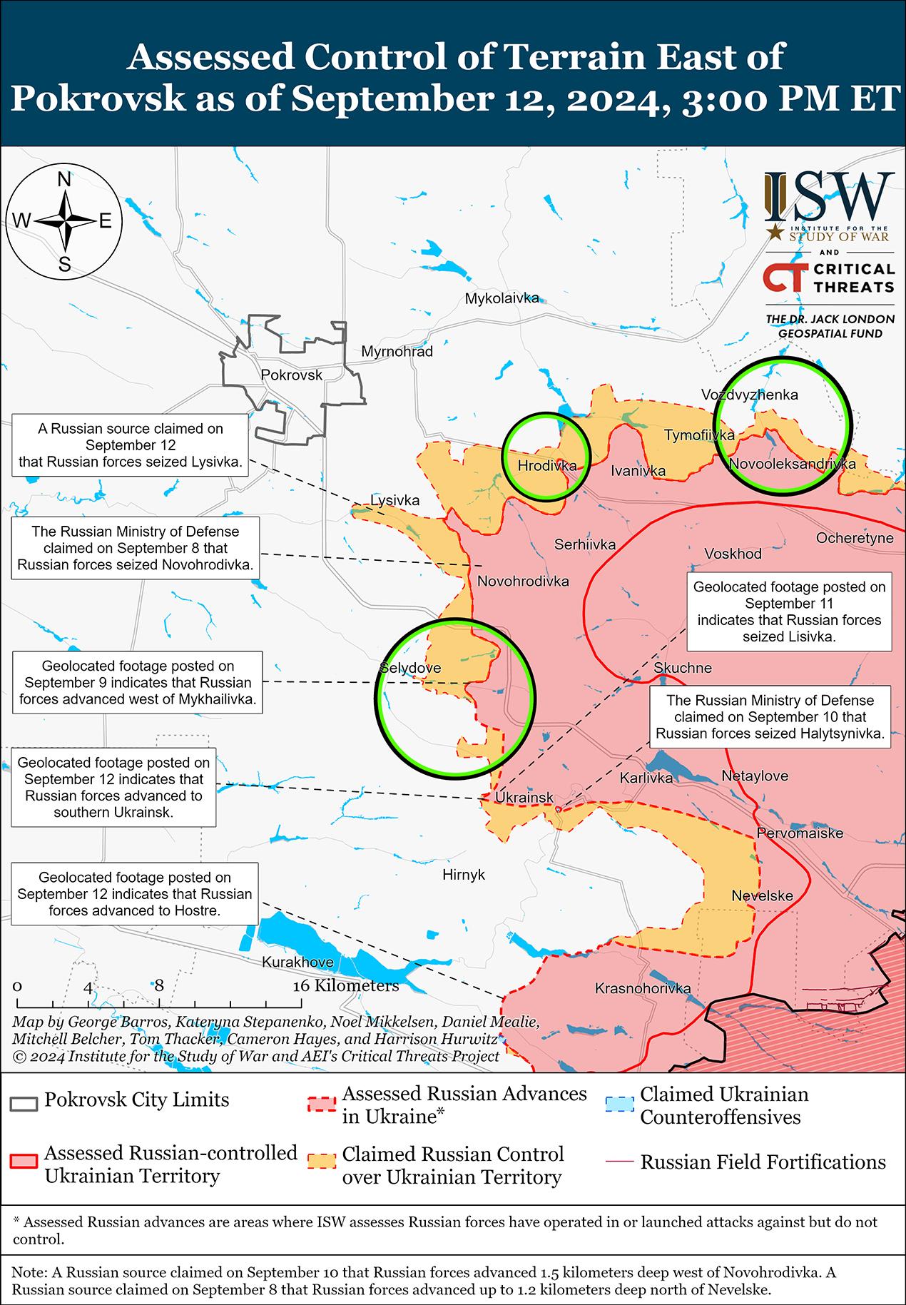 В последнее время враг продвинулся к юго-востоку от Покровска и 12 сентября продолжил наступательные действия на Покровском направлении. Опубликованные 11 сентября геолоцированные кадры, на которых российские солдаты свободно действуют на юге Украинска (к юго-востоку от Покровска) и общаются с украинскими гражданскими волонтерами, свидетельствуют о том, что в последнее время российские войска продвинулись в южной части города. [60] На дополнительных геолоцированных кадрах, опубликованных 12 сентября, видно, что российские войска продвинулись вдоль железной дороги к северо-востоку от Новогродовки (к юго-востоку от Покровска). [61] Российские военные блогеры также утверждали, что российские войска продвинулись в юго-восточную часть Лысовки (к западу от Новогродовки, а не населенный пункт под названием Лысовка к востоку от Украинска) и захватили весь населенный пункт, хотя в ISW не обнаружили визуального подтверждения этих заявлений. [62] Российские военные блогеры утверждали, что российские войска продолжают продвигаться к северу и юго-востоку от Украинска, пытаясь окружить украинские войска, обороняющие город. [63] Российские военные блогеры утверждали, что российские войска, действовавшие к юго-востоку от Покровска, продвигались по фронту шириной 8,5 км и глубиной 2,6 км к югу от Нетайлового, к западу от Невельского и к северу от Красногоровки, хотя это согласуется с предыдущими заявлениями России в этом районе. [64] 11 и 12 сентября враг продолжил наступательные действия к востоку от Покровска в районе Воздвиженки, Новоалександровки, Зеленого Поля и Гродовки и к юго-востоку от Покровска в направлении Новотроицкого и в районах населенных пунктов Новогродовка, Селидово, Михайловка, Украинск и обоих населенных пунктов под названием Лысовка. [65] Российский военный блогер заявил, что интенсивная активность украинских беспилотников с видом от первого лица (FPV) на Покровском направлении осложняет российские наземные атаки, ухудшает и без того растянутую российскую логистику и усугубляет российские потери. [66] Украинский военный обозреватель Константин Машовец заявил, что российское военное командование сосредоточило значительное количество сил на южном фланге Покровского направления и что подразделения 1-й, 9-й, 114-й и 110-й мотострелковых бригад (все 51-я ОА, бывший 1-й АК); подразделения 438-го мотострелкового полка (90-я танковая дивизия, 41-я ОА, Центральный военный округ; другие части 90-й танковой дивизии; и неустановленные элементы 2-й ОА (ЦВО) атакуют к юго-востоку от Покровска. [67]