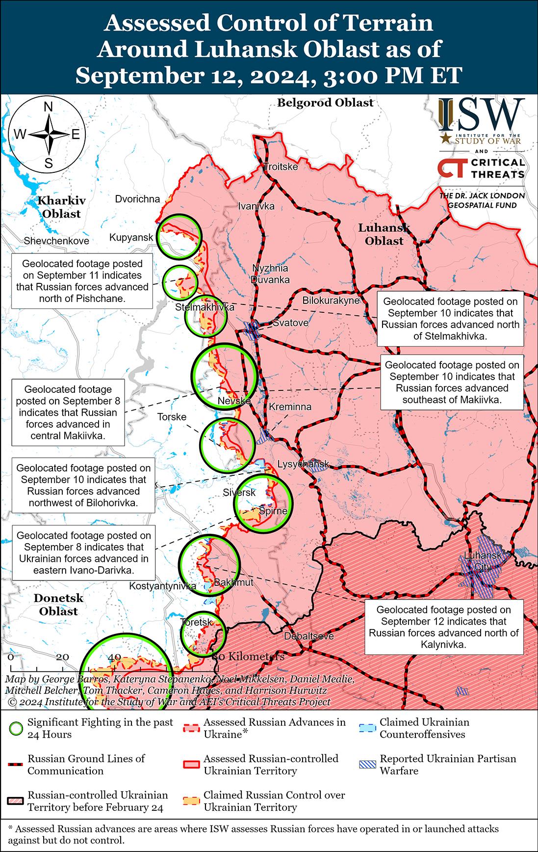 12 сентября российские войска продолжили ограниченные наземные атаки к северу и северо-востоку от Харькова, но не добились подтвержденных успехов. Российские войска обстреляли к северу от Харькова в районе Глубокого и Липцах и к северо-востоку от Харькова в районах Волчанска, Тихое и Гатище. [47] Харьковская группировка войск Украины сообщила 12 сентября, что российские силы сосредоточены на восстановлении боеспособности подразделений 11-го танкового полка РФ (18-я мотострелковая дивизия Ленинградского военного округа) на передовых позициях в районе Глубокого и боеспособности подразделений 82-го мотострелкового полка (69-я мотострелковая дивизия), 6-я общевойсковая армия [ОА], ЛВО) и 4-я добровольческая разведывательно-штурмовая бригада в Волчанске. [48] Харьковская группировка войск Украины сообщала, что подразделения российской 136-й мотострелковой бригады (58-я общевойсковая армия, Южный военный округ) понесли потери в районе Тихое. Спикер Харьковской группировки войск полковник Виталий Саранцев 12 сентября заявил, что российские войска на Харьковском направлении начали вводить в бой призывников, хотя неясно, имеет ли он в виду, что российские войска перебросили срочников на территорию Украины или в приграничную зону в Белгородской области. [49] Президент России Владимир Путин ранее обещал, что Россия не будет использовать призывников для участия в боевых действиях в Украине, но российские военные полагаются на них для обеспечения безопасности границ и реагирования на украинское вторжение в Курскую область. [50] ISW не зафиксировал подтверждений участия призывников в наступательной операции России на севере Харьковской области или в других районах Украины.