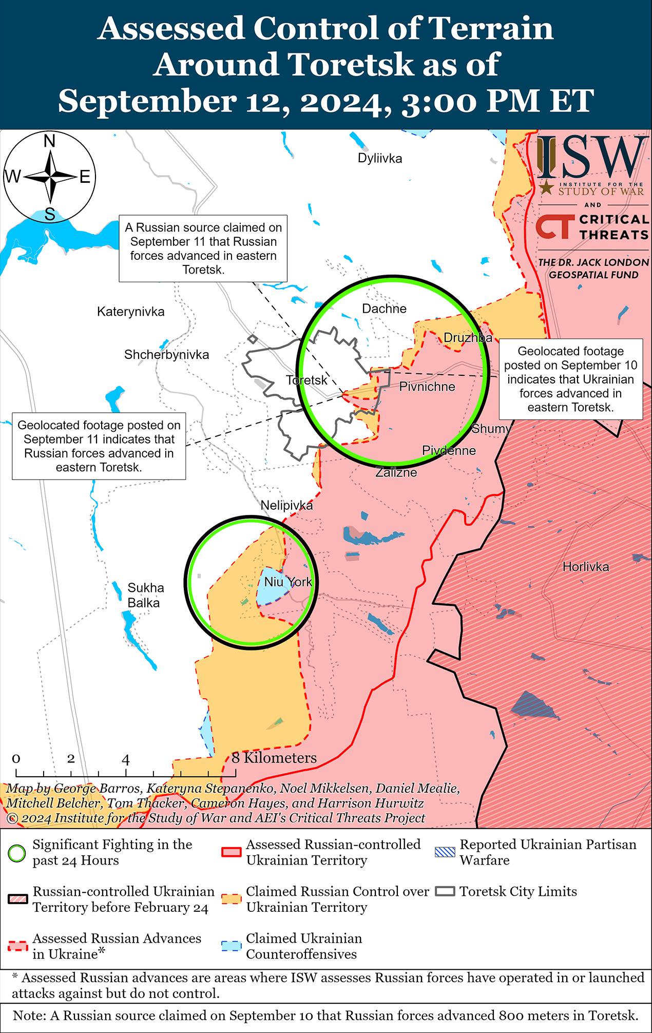 В последнее время российские войска продвигались по полям к западу от Красногоровки на фоне продолжающихся наступательных действий к западу от Донецка. Геолоцированные кадры, опубликованные 12 сентября, указывают на то, что российские войска недавно продвинулись в Острое (к западу от Донецка) и, вероятно, продвинулись в полях к северо-востоку и юго-востоку от населенного пункта. [68] Российские войска в последнее время активизировали свои давние наступательные усилия по ликвидации украинского выступа к западу и юго-западу от Донецка, и российские войска, похоже, замкнули котел к юго-западу от Красногоровки, продвигаясь в Острое. [69] Российские военные блогеры утверждали, что российские механизированные группы, несмотря на значительные потери, прорвались к Острое и закрепились в населенном пункте. [70] 11 и 12 сентября российские войска также продолжили штурмовые действия к западу от Донецка в районе Георгиевки. [71]