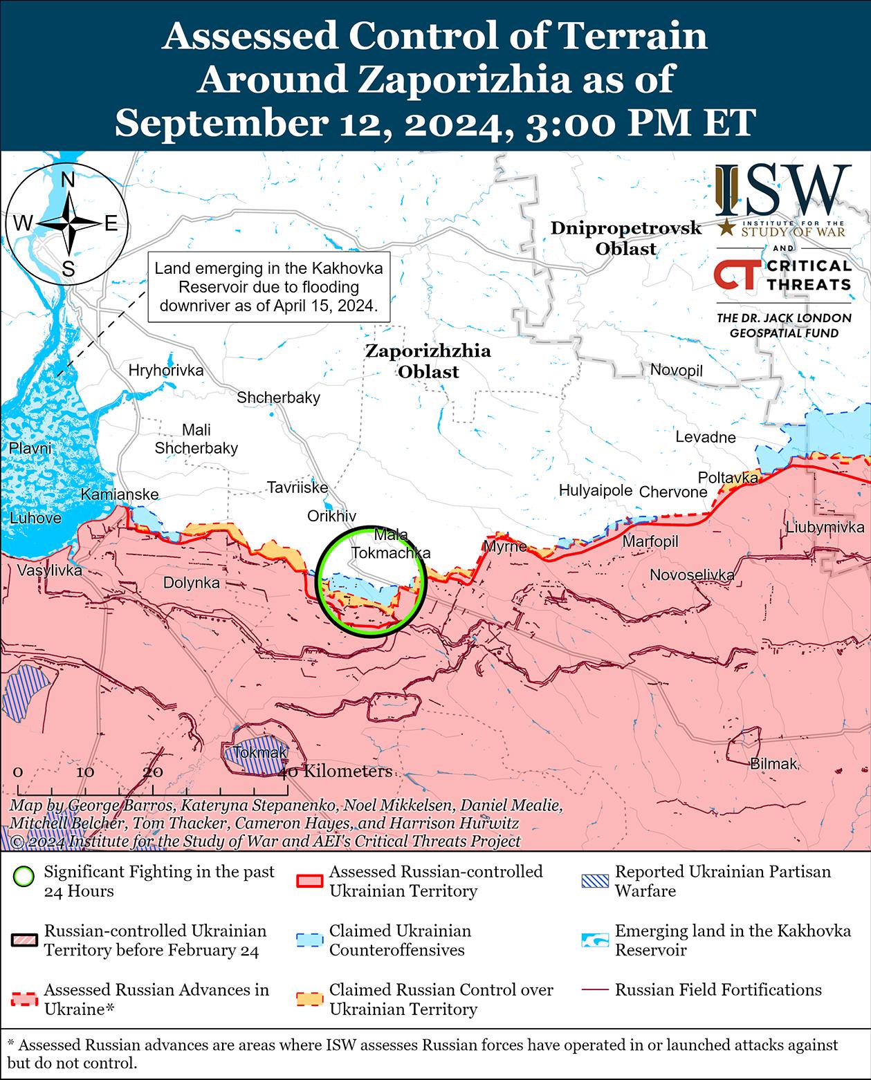 Бои продолжались на западе Запорожской области в районе Малой Токмачки (северо-восточнее Работино) 11 и 12 сентября, но подтвержденных изменений на линии фронта не было. [74] Российский военный блогер утверждал, что российские войска захватили украинскую позицию к западу от Новопокровки (к северо-востоку от Работино) и близлежащий лесной массив, однако в ISW не обнаружили подтверждения этого заявления. [75]