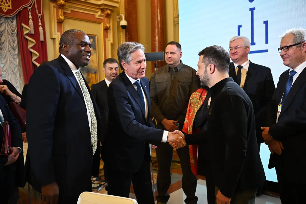Министр иностранных дел Великобритании Дэвид Лэмми (слева) наблюдал за тем, как госсекретарь Энтони Блинкен (в центре) пожимал руку президенту Украины Владимиру Зеленскому в Киеве в среду. Предоставлено…Фото пула Леона Нила