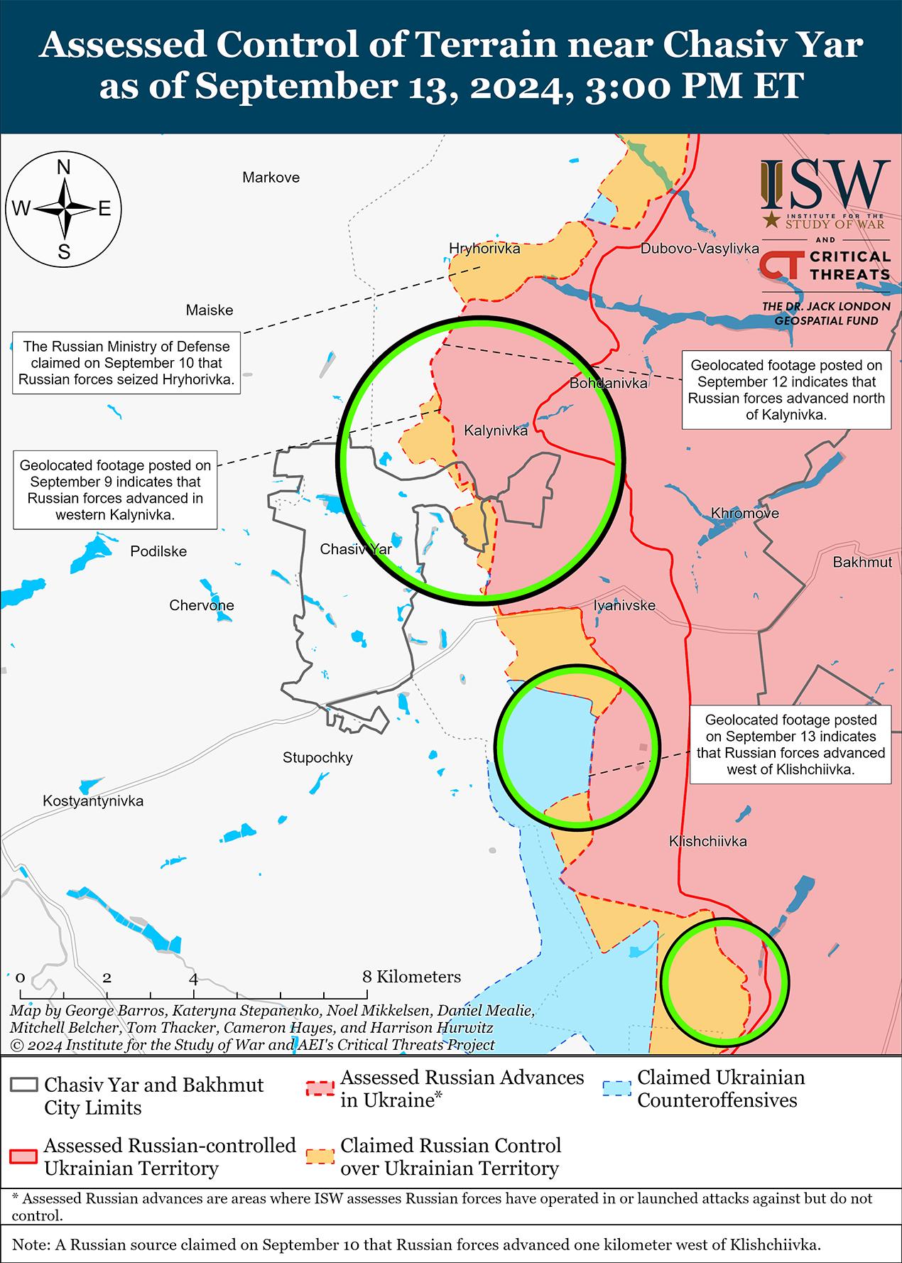 В последнее время российские войска продвинулись к юго-востоку от Часова Яра на фоне продолжающихся боев в этом районе 13 сентября. Геолоцированные кадры, опубликованные 13 сентября, свидетельствуют о том, что в последнее время российские войска продвинулись к западу от Клещеевки (к юго-востоку от Часова Яра). [56] Продвижение к западу от населенного пункта указывает на то, что российские войска еще больше укрепили контроль над Клещеевкой и что российские войска развили способность сохранять постоянное присутствие в Клещеевке и использовать населенный пункт и его окрестности в качестве плацдарма для наступательных действий. Клещеевка долгое время была спорной «серой зоной», и способность России установить контроль в этом районе облегчит попытки России попытаться пересечь канал Северский-Донец Донбасс к западу от Клещеевки. Российский военный блогер заявил, что российские войска продвинулись в районе Ивановского (к востоку от Часова Яра), но ISW не обнаружил визуального подтверждения этого заявления. [57] 12 и 13 сентября продолжались бои в районе Часова Яра, к юго-востоку от Часова Яра в районе Андреевки и к югу от Часова Яра в районе Ступочки. [58]