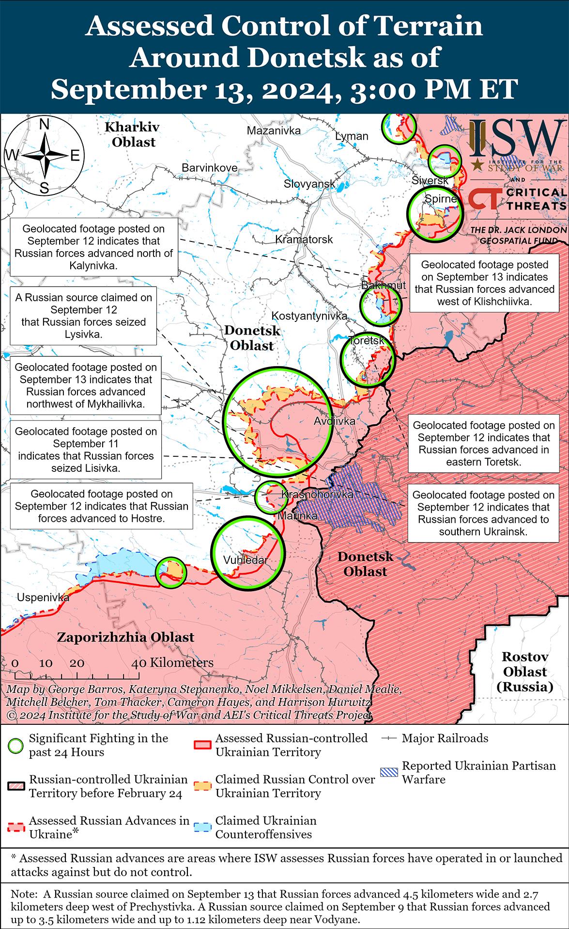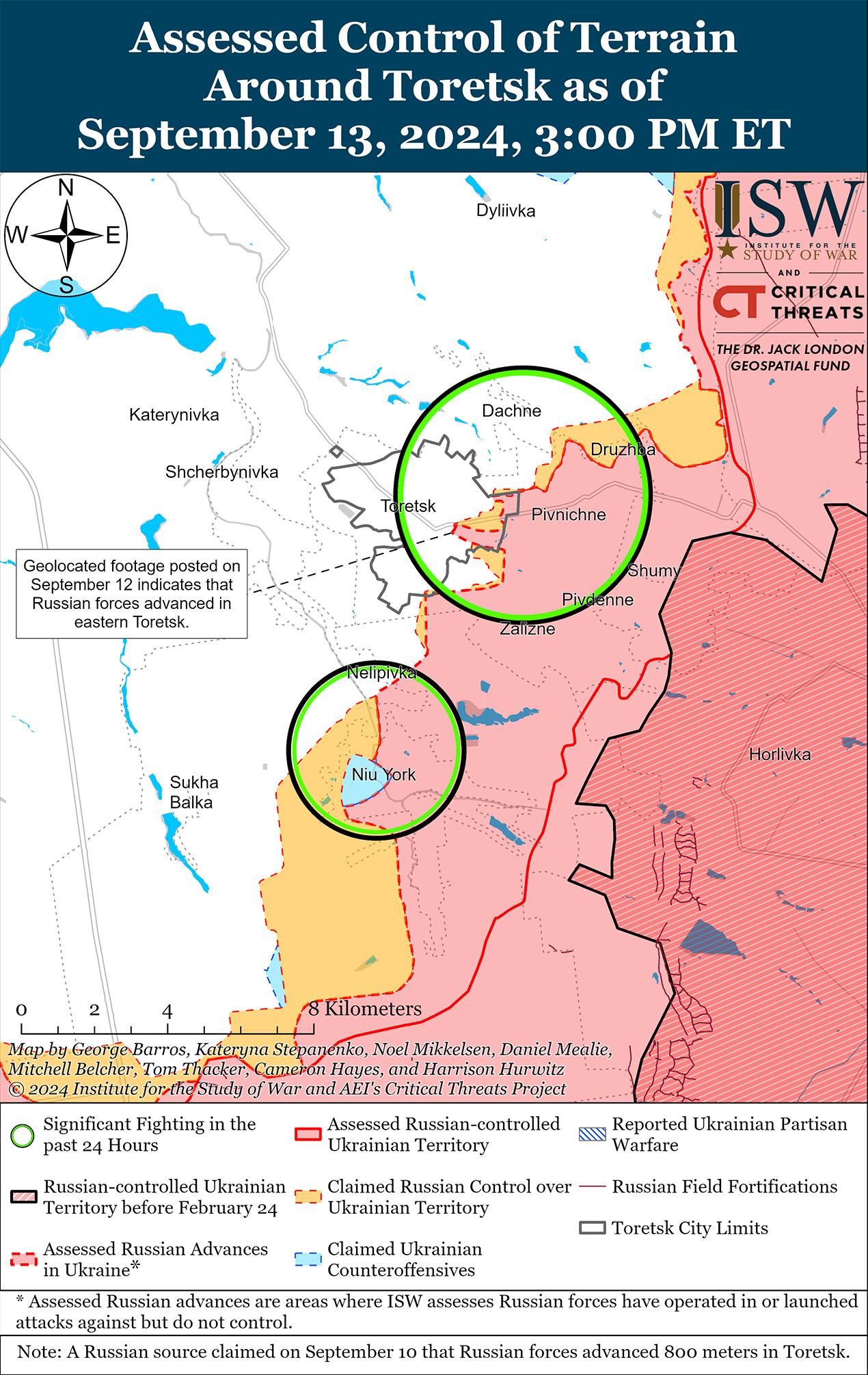 Российские войска недавно незначительно продвинулись под Торецком на фоне продолжающихся атак в этом районе 13 сентября. Геолоцированные кадры, опубликованные 12 сентября, указывают на то, что российские войска в последнее время незначительно продвинулись в восточной части Торецка. [59] 12 и 13 сентября российские войска продолжали наступательные действия к северо-востоку от Торецка в районе Дачного, в самом Торецке и к югу от Торецка в районе Нелиповки и Нью-Йорка. [60]