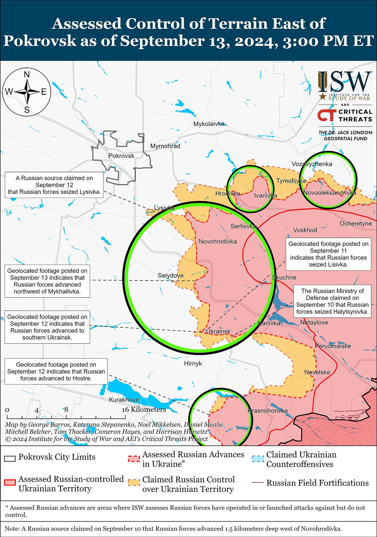 Российские войска недавно незначительно продвинулись к юго-востоку от Покровска на фоне продолжающихся штурмов к востоку и юго-востоку от города 13 сентября. Геолоцированные кадры, опубликованные 13 сентября, указывают на то, что российские войска недавно незначительно продвинулись к северо-западу от Михайловки (к юго-востоку от Покровска и непосредственно к востоку от Селидово). [61] Российские военные блогеры утверждали, что российские войска продвинулись в районе Гродовки (к западу от Покровска) и под Украинском (к юго-западу от Покровска), однако в ISW не обнаружили визуального подтверждения этих заявлений. [62] 12 и 13 сентября продолжались бои к западу от Покровска в районе Зеленого Поля, Воздвиженки, Новоалександровки, Миролюбовки, а также к юго-востоку от Покровска в направлении Новотроицкого и в районах населенных пунктов Новогродовка, Селидово, Михайловка, Украинск и Желанное Первое. [63]