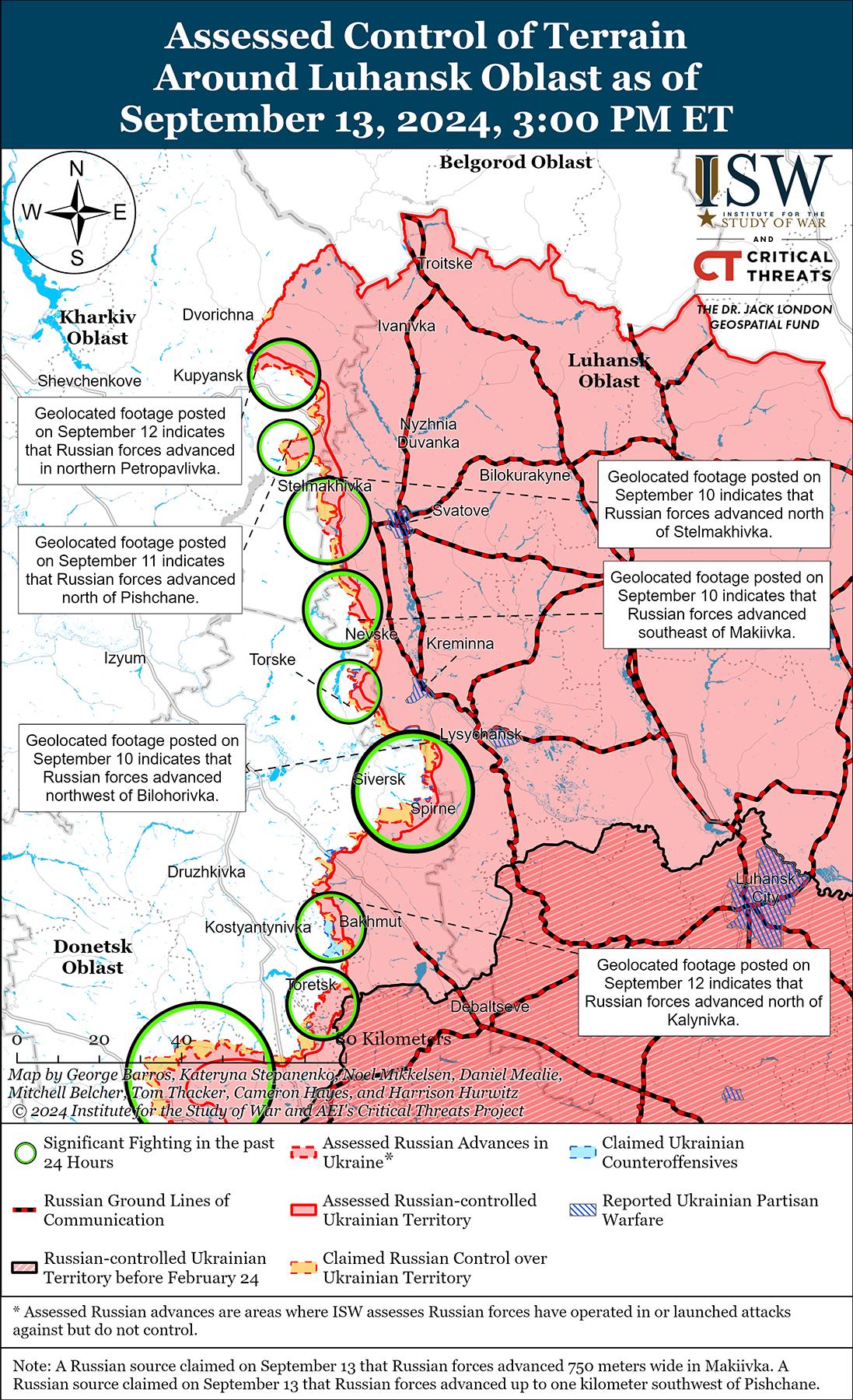 В последнее время российские войска продвинулись к востоку от Купянска на фоне продолжающихся наступательных действий вдоль линии Купянск-Сватово-Кременная 13 сентября. Геолоцированные кадры, опубликованные 12 сентября, указывают на то, что российские войска недавно продвинулись на севере Петропавловки (к востоку от Купянска). [50] Российский военный блогер утверждал, что российские войска продвинулись на расстояние до километра в глубину вдоль оврага к юго-западу от Песчаного (к северо-западу от Сватово) и до 750 метров в Макеевке (к северо-западу от Кременной), хотя в ISW не зафиксировали подтверждения этих заявлений. [51] Российские войска продолжили наступательные действия к северо-востоку от Купянска в районе Синьковки; восточнее Купянска в районе Петропавловки; к северо-востоку от Сватово в районах населенных пунктов Глушковка, Колесниковка и Стельмаховка и в направлении Лозовой; к западу от Сватово в районе Копанки; юго-западнее Сватово в районе Дружелюбовки; северо-западнее Кременная в районах населенных пунктов Грековка, Макеевка и Невское; к западу от Кременной в районе Ямполовки и Торского; и южнее Кременной в районе Серебрянки 12 и 13 сентября. [52] Украинский военнослужащий, действовавший на Лиманском направлении, заявил 12 сентября, что российские войска усиливают удары термобарической артиллерии ТОС-1А в этом районе. [53] Сообщается, что в районе Серебрянки действуют подразделения российской 7-й мотострелковой бригады (2-й армейский корпус Луганской Народной Республики [ЛНР] [по сообщениям, переформированного в 3-ю общевойсковую армию]). [54]