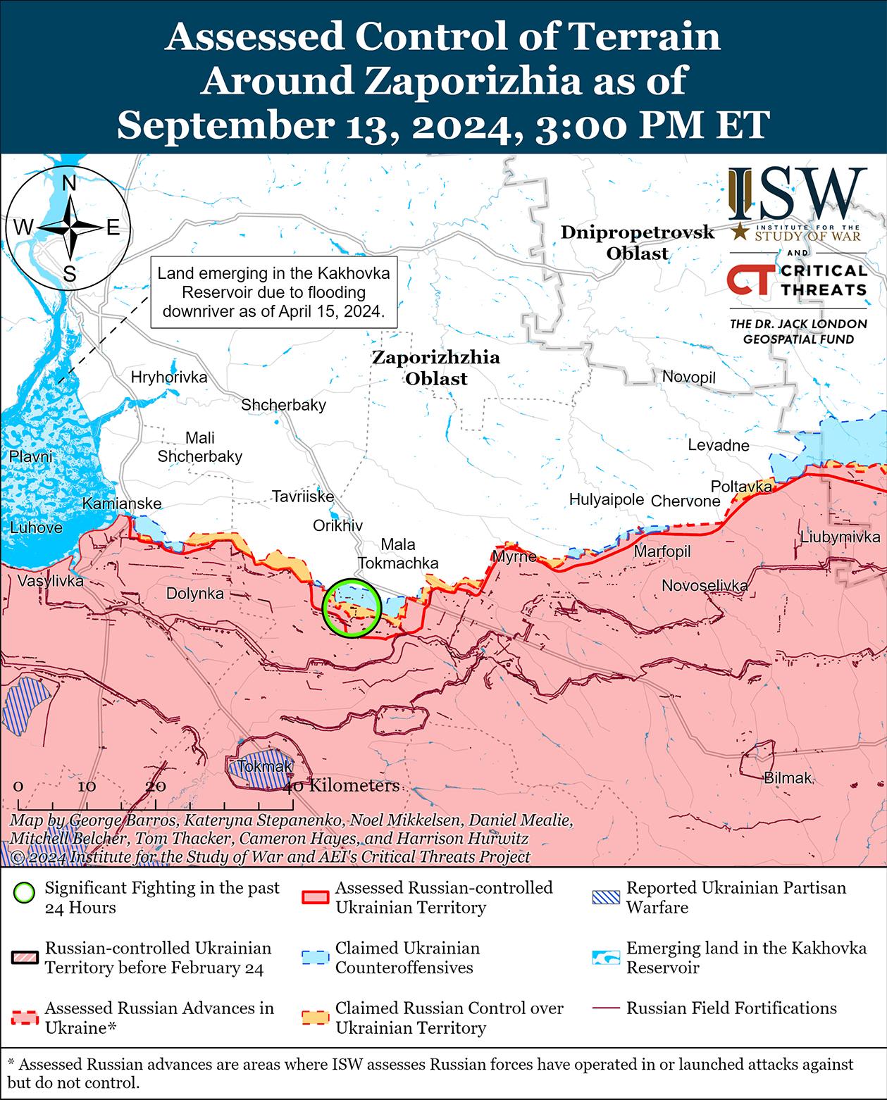 12 и 13 сентября на западе Запорожья в районе Работино продолжались позиционные бои, но подтвержденных изменений на линии фронта не было. [71] Пресс-секретарь Таврийской группировки войск капитан Дмитрий Лиховой сообщил, что российские войска интенсивно обстреливают украинские позиции на Запорожском направлении, многие из которых расположены в спорных «серых зонах» или районах позиционных боев. [72] По словам Лихового, из-за российских обстрелов украинские силовики вынуждены занимать новые позиции, особенно на Ореховском направлении (район Работино). 13 сентября российский военный блогер опубликовал кадры, на которых якобы видно, как операторы беспилотников 4-й военной гвардейской базы России (58-я общевойсковая армия [ОА], Южный военный округ [ЮВО]) нанесли удар по украинским позициям в районе Каменского, вероятно, в Запорожской области. [73]