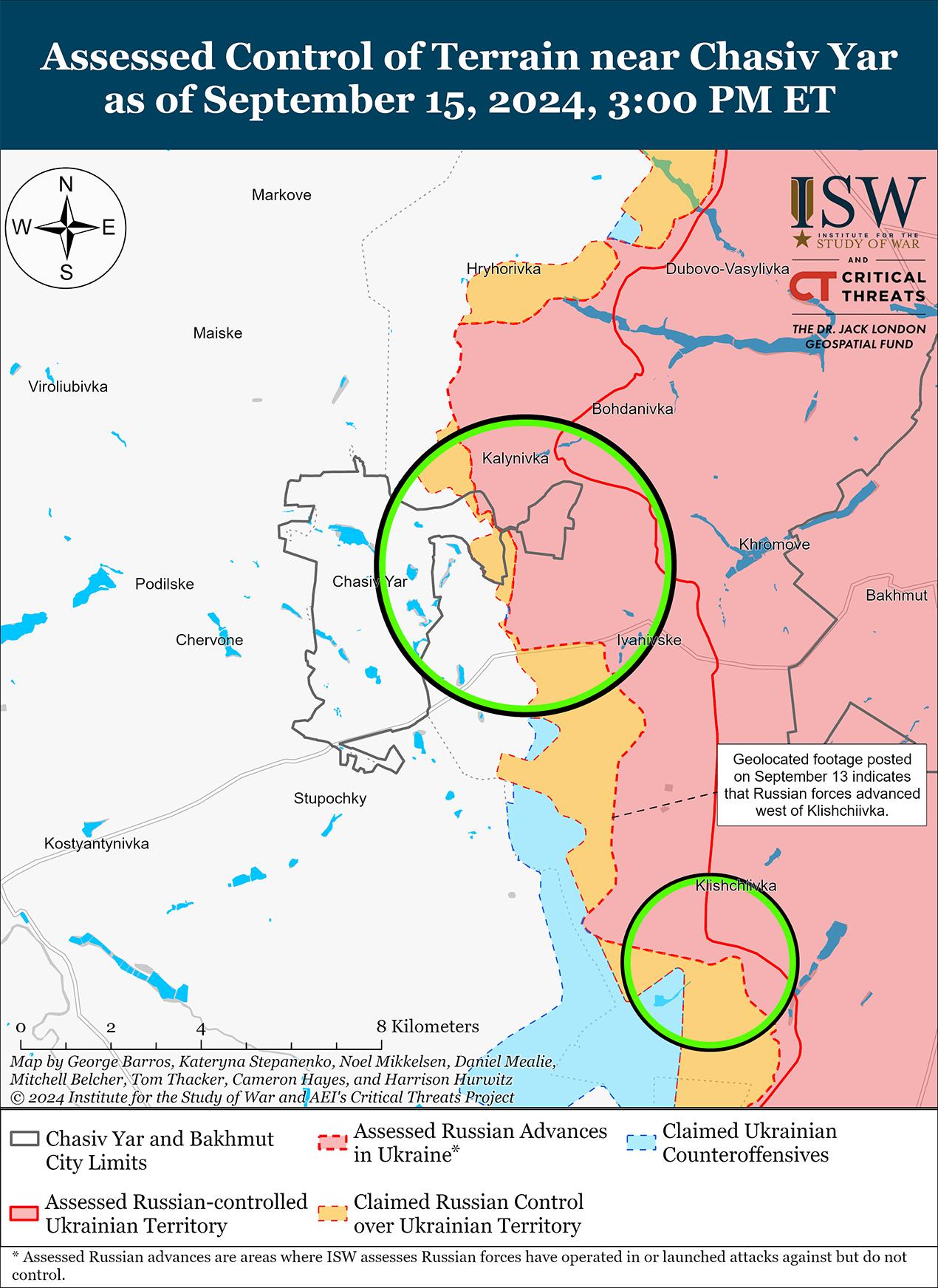 15 сентября враг продолжил наступательные действия в районе Часова Яра, но подтвержденных изменений на линии фронта не было. 14 и 15 сентября враг вел наступательные действия в районах населенных пунктов Часов Яр и Андреевка (к юго-востоку от Часова Яра) и в направлении Ступочки (к югу от Часова Яра). [55]