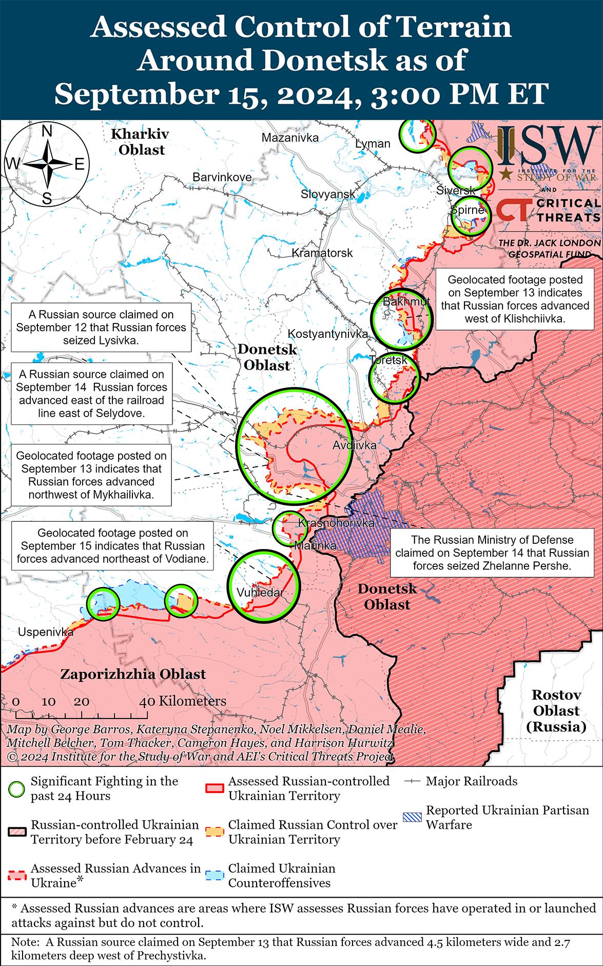 Сообщается, что 15 сентября российские войска продвинулись на Покровском направлении, но подтвержденных изменений на линии фронта не было. Российские военные блогеры утверждали, что российские войска продвинулись к востоку от Селидово, на юго-западе Украинска (оба к юго-востоку от Покровска), а также к югу и востоку от Украинска, но ISW не обнаружил подтверждения этих заявлений. [58] 14 и 15 сентября российские войска вели наступательные действия к востоку от Покровска в районах населенных пунктов Сухая Балка, Воздвиженка, Зеленое Поле, Новоалександровка, Гродовка, Новоторецк и Красный Яр, а к юго-востоку от Покровска атаковали вблизи Селидово, Украинска, Долиновки, Новогродовки, Мариновки, Михайловки, Желанного Первого, Желанного Второго и Лысовки (к западу от Новогродовки). [59] Российский военный блогер заявил, что темпы российского наступления на Покровском направлении замедлились и что российским войскам необходимо перебросить логистику и техническое обеспечение вперед по российским наземным линиям коммуникаций (НЛК). [60]