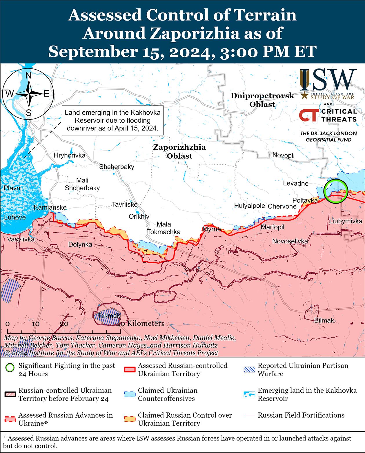 На западе Запорожской области продолжались позиционные бои, но 15 сентября подтвержденных изменений на линии фронта не было. [69] На геолоцированных кадрах, опубликованных 15 сентября, видно, как диверсионно-разведывательная группа 4-й военной базы РФ (58-я общевойсковая армия, Южный военный округ) недавно проводила рейд по украинским позициям в районе Каменского (к юго-западу от Орехова и к югу от Степногорска), но ISW не зафиксировал сообщений или свидетельств того, что российские войска ведут штурмы или продвигаются в этом районе. [70] 14 сентября пресс-секретарь Таврийской группировки войск капитан Дмитрий Лиховой заявил, что темпы российских наступательных действий в Запорожской области в последнее время снизились из-за нехватки ресурсов для ведения одновременных наступательных действий на нескольких направлениях и в настоящее время сосредоточены на первоочередных наступательных действиях на Покровском и Кураховском направлениях (к западу и юго-западу от Донецка) и вторжении Украины в Курскую область. [71] Лиховой добавил, что несколько недель назад российские войска передислоцировали часть неуказанных батальонов, полков и бригад из Запорожской области (предположительно, в Курскую область) и что в настоящее время российские войска проводят оперативную паузу для реорганизации оставшихся в Запорожской области подразделений. [72]