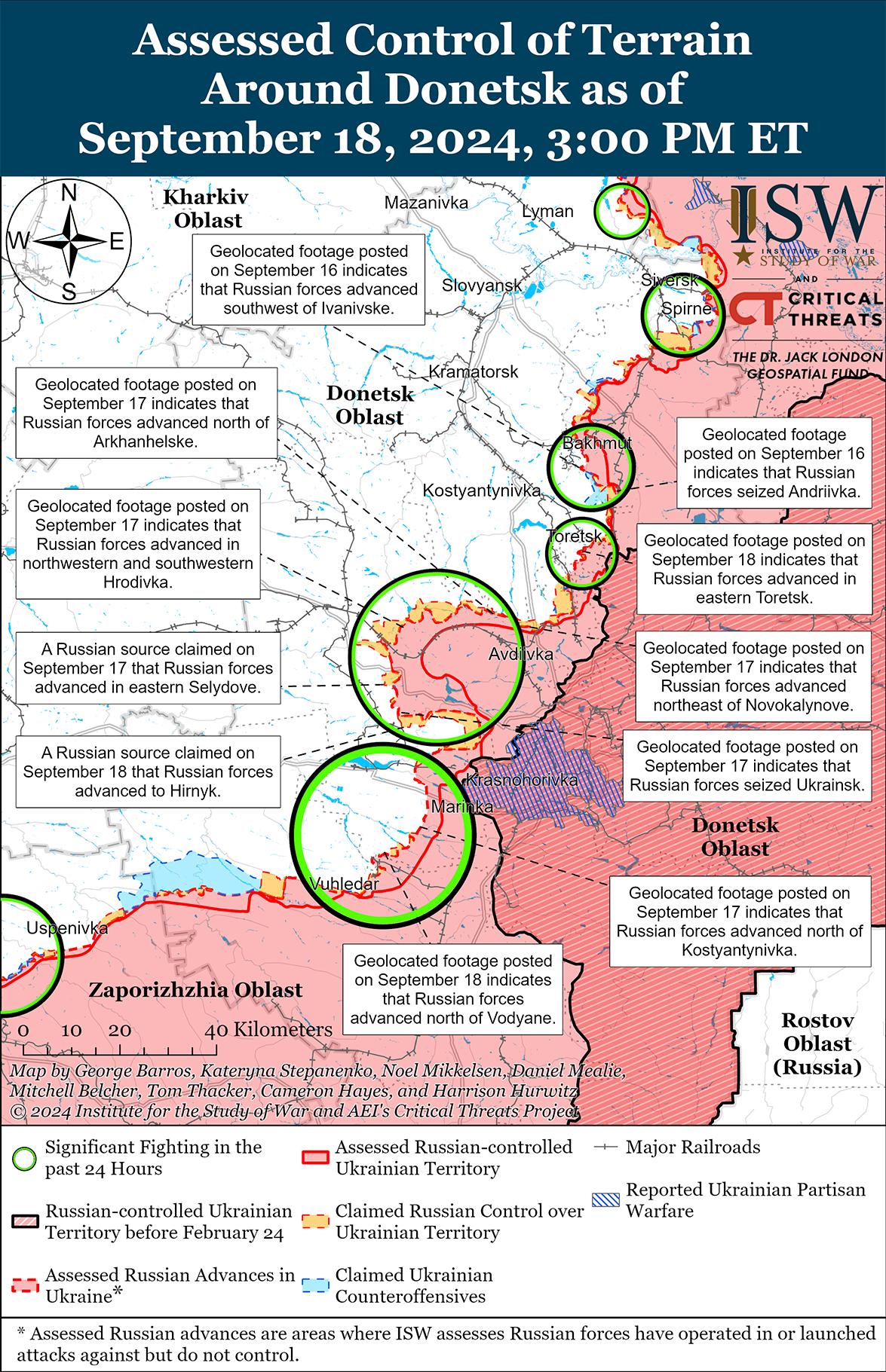 Российские войска недавно добились незначительных успехов в Торецке на фоне продолжающихся российских наступательных операций в этом районе 18 сентября. Геолоцированные кадры, опубликованные 18 сентября, указывают на то, что российские войска недавно продвинулись вдоль улицы Центральной в восточной части Торецка, а российские военные блогеры утверждали, что российские войска продвинулись дальше на север и запад в восточной части Торецка. [50] Другой российский военный блогер заявил, что российские войска продвинулись в лесистой местности к юго-востоку от Торецка, хотя ISW не зафиксировал подтверждения этому заявлению. [51] Российские войска также продолжили наступательные действия к северо-востоку от Торецка в районе Дачного; южнее Торецка в районе Нелиповки и Нью-Йорка; юго-западнее Торецка в районе Александрополя; и под Торецком в направлении Щербиновки 17 и 18 сентября. [52]