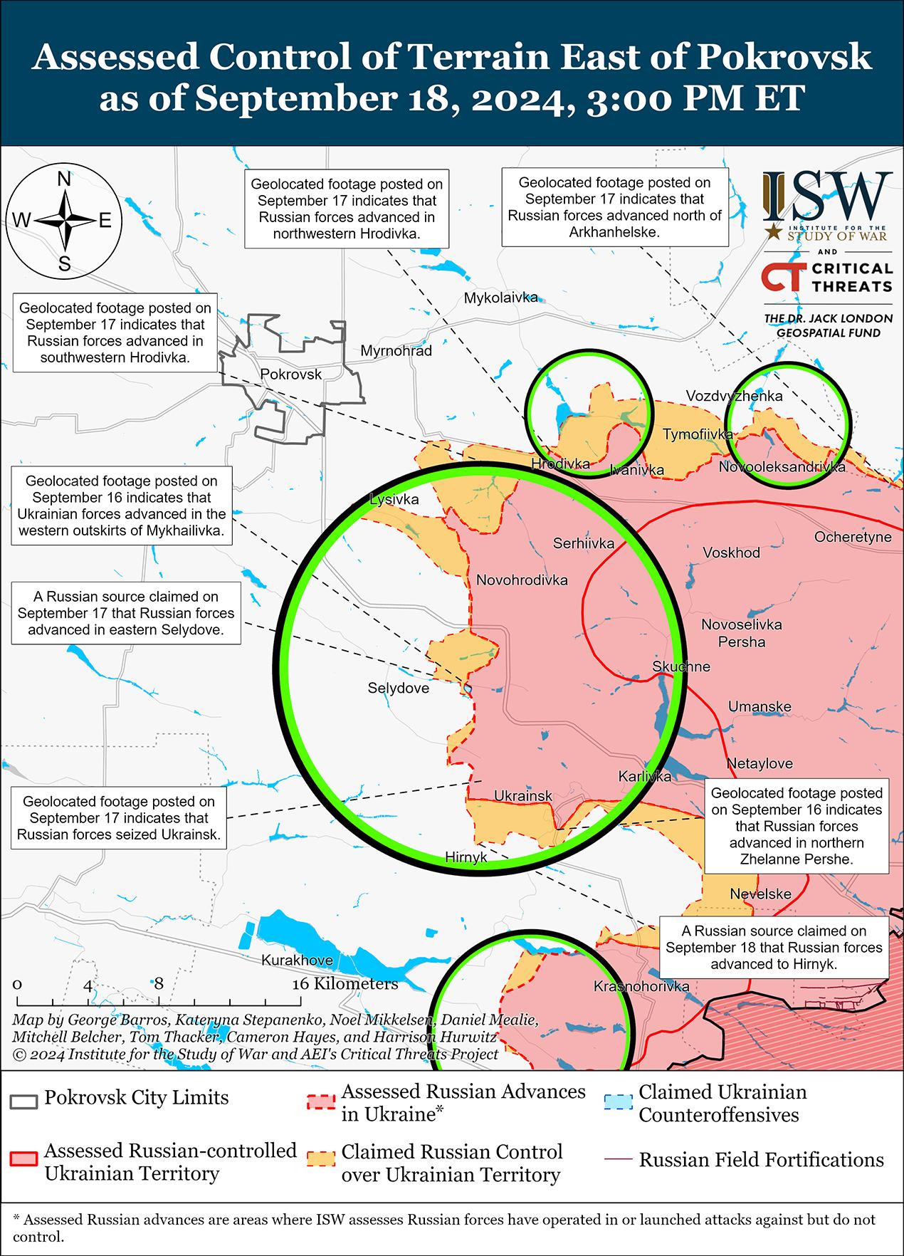 Сообщается, что российские войска продолжали продвигаться к юго-востоку и востоку от Покровска, но 18 сентября не добились подтвержденных успехов на Покровском направлении. 17 и 18 сентября российские военные блогеры утверждали, что российские войска продвинулись на запад через реку Журавка в районе Гродовки (к востоку от Покровска) и на севере Гродовки. [53] Российские военные блогеры утверждали, что российские войска, действовавшие к юго-востоку от Покровска, продвинулись до улицы Голая на северо-востоке Селидово и до северных окраин Горняка. [54] Другой российский военный блогер 18 сентября продолжал утверждать, что российские войска захватили Гродовку и зачищают город. [55] Однако ISW не обнаружил подтверждения этих российских заявлений. 17 и 18 сентября враг продолжил наступательные действия к востоку от Покровска в районах населенных пунктов Новоалександровка, Новоторецкое, Зеленое Поле, Воздвиженка, Гродовка и Красный Яр и к юго-востоку от Покровска в районах населенных пунктов Новогродовка, Орловка, Селидово, Михайловка, Николаевка, Мариновка, Желанное Первое, Украинск и Цукурино. [56] Сообщается, что в Украинске действуют подразделения российской 114-й мотострелковой бригады (51-я общевойсковая армия, бывший 1-й АК Донецкой Народной Республики [ДНР]). [57]