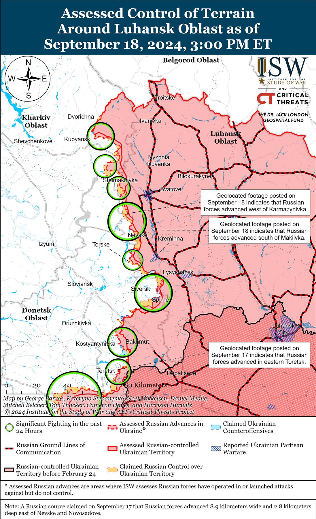 В последнее время российские войска добились подтвержденных успехов на линии Купянск-Сватово-Кременная. На геолоцированных кадрах, опубликованных 18 сентября, видно, что российские войска продвинулись к западу от Табаевки (к юго-востоку от Купянска), к западу от Кармазиновки (к юго-западу от Сватово) и на юг вдоль трассы О-131306 (Сватово-Макеевка) к югу от Макеевки (северо-западнее Кременной). [42] Российский военный блогер утверждал, что российские войска также продвинулись в лесных районах вблизи Песчаного (к юго-востоку от Купянска) и Невского (к северо-западу от Кременной), однако в ISW не обнаружили визуальных доказательств этого. [43] По данным Генштаба Украины, российские войска вели наземные атаки к северо-востоку от Купянска в районе Синьковки; к юго-востоку от Купянска в районах населенных пунктов Кругляковка, Колесниковка, Петропавловка и Новоосиново; северо-западнее Сватово в районе Стельмаховки и Лозовой; к западу от Сватово в районе Андреевки; юго-западнее Сватово в районе Черещины, Дружелюбовки, Грековки; и к северо-западу от Кременной в районе Макеевки, Невского и Торского. [44] Сообщается, что подразделения российского 375-го отдельного противотанкового артиллерийского дивизиона (47-я танковая дивизия, 1-я гвардейская танковая армия, Московский военный округ) продолжают действовать под Купянском. [45]