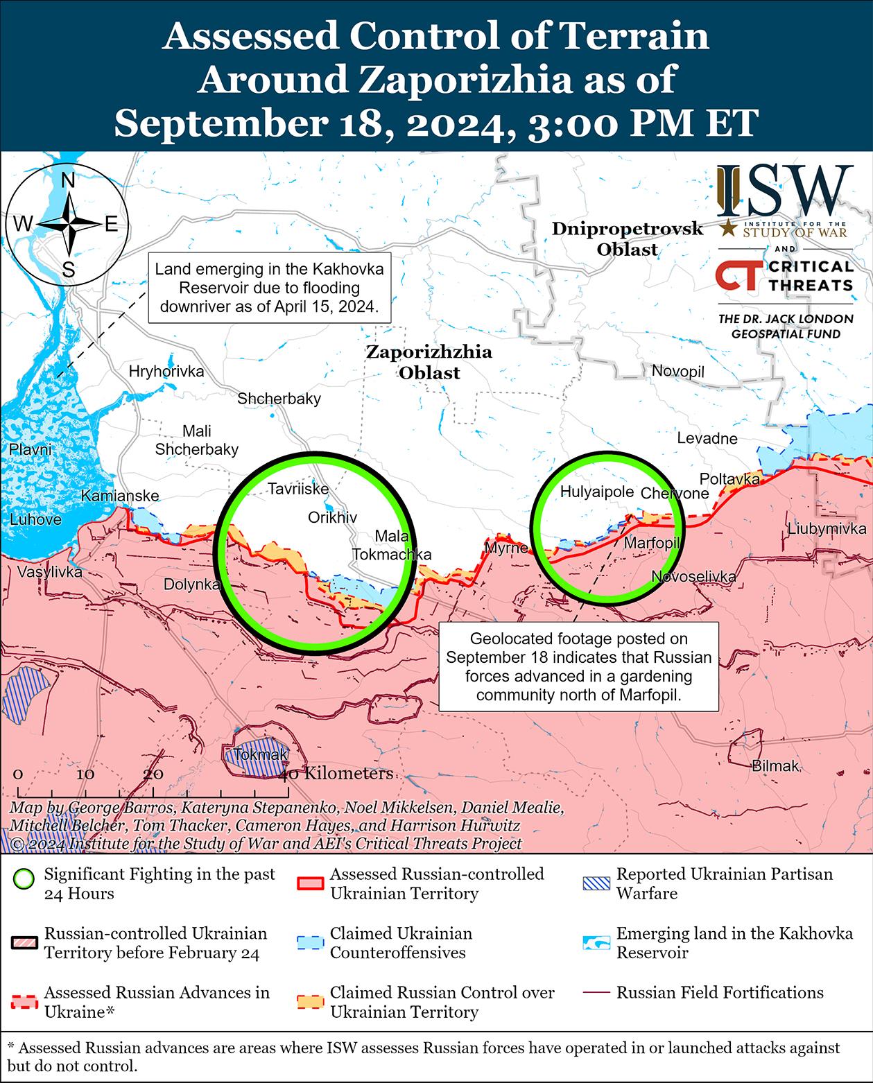 В последнее время российские войска продвинулись на востоке Запорожской области в районе Гуляйполя. Геолоцированные кадры, опубликованные 18 сентября, указывают на то, что российские войска недавно добились успехов в садовом районе на северо-западе Марфополя (к юго-востоку от Гуляйполя), а 18 сентября российский военный блогер заявил, что российские войска захватили весь Марфополь и незначительно продвинулись на полях к северо-западу от населенного пункта. [67] Генеральный штаб Украины сообщил, что 18 сентября российские войска атаковали в районе Гуляйполя. [68] ISW не наблюдал подтвержденных российских успехов в этом районе с 18 июля 2024 года. [69]