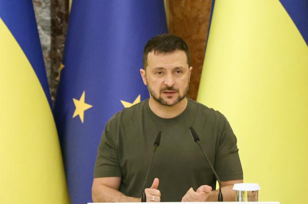 Президент України Володимир Зеленський виступає на спільній прес-конференції із президентом Європейської комісії у Києві у п’ятницю. (Анатолій Степанов/AFP/Getty Images)