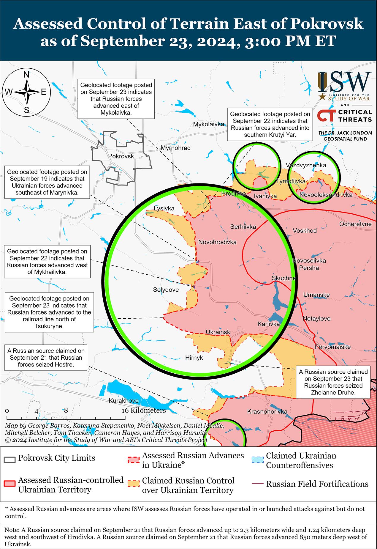 Российские войска продвинулись к востоку от Покровска на фоне продолжающихся наступательных действий 23 сентября. Геолоцированные кадры, опубликованные 23 сентября, свидетельствуют о том, что российские войска в последнее время продвинулись к северу от Цукурино и к востоку от Николаевки (оба к юго-востоку от Покровска). [48] 22 и 23 сентября российские военные блогеры утверждали, что российские войска продвинулись к северо-западу и юго-западу от Украинска и к северу от Цукурино; и что российские войска захватили Желанное Второе и Крутой Яр (все к юго-востоку от Покровска). [49] Однако ISW не обнаружил подтверждения этих заявлений. Враг провел небольшой механизированный штурм против украинских сил к северу от Цукурино. [50] 22 и 23 сентября бои продолжались к востоку от Покровска в районе Воздвиженки, Новоторецкого, Гродовки и Красного Яра и к юго-востоку от Покровска в районе Новогродовки, Селидово, Орловки, Мариновки, Михайловки и Миролюбовки. [51] Сообщается, что на Покровском направлении действуют подразделения российской 55-й мотострелковой бригады (41-я общевойсковая армия, Центральный военный округ). [52] 23 сентября Машовец заявил, что подразделения 9-й мотострелковой бригады ВС РФ (51-я ОА [бывший 1-й армейский корпус Донецкой Народной Республики (АК ДНР)], Южный военный округ [ЮВО]); 1-я мотострелковая бригада (51-я ОА, ЮВО); 5-я мотострелковая бригада (51-я ОА, ЮВО); и 110-я мотострелковая бригада (51-я ОА, ЮВО); мобилизационные резервы и неустановленные подразделения территориальной обороны продвигаются в сторону реки Волчья к юго-востоку от Покровска с севера. [53] Машовец также заявил, что в районе Новогродовки действуют подразделения 15-й и 30-й мотострелковых бригад РФ (обе входят в состав 2-й ОА, ЦВО), а вблизи линии Горняк-Курахово действуют части 27-й мотострелковой дивизии (2-я ОА), 114-й мотострелковой бригады (51-я ОА, ЮВО) и 1-й «Славянской» мотострелковой бригады (51-я ОА, ЮВО). Газета Financial Times сообщила 23 сентября, что командир украинского батальона заявил, что тактика российских войск на Покровском направлении изменилась в середине лета и что теперь российские войска используют более быстрые и мобильные подразделения, сродни штурмовой тактике группы Вагнер. [54] Оператор украинского беспилотника заявил, что российские войска используют небольшие пехотные подразделения для атаки украинских сил одновременно с нескольких направлений, что затрудняет их поражение.