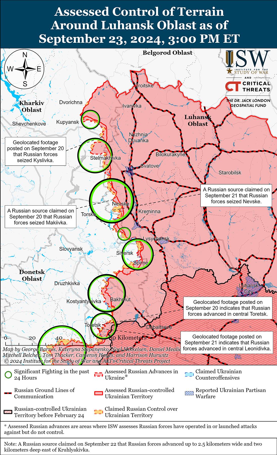 В последнее время российские войска продвинулись к юго-востоку от Купянска на фоне продолжающихся наступательных действий на линии Купянск-Сватово-Кременная. На геолоцированных кадрах, опубликованных 21 и 23 сентября, видно, что российские войска продвинулись в полях к востоку от Колесниковки (к юго-востоку от Купянска) и к востоку от Крутяковки (к югу от Купянска) соответственно. [36] Российские военные блогеры заявили 23 сентября, что российские войска незначительно продвинулись в районе Синьковки (к северо-востоку от Купянска), значительно продвинулись к юго-западу от Песчаного (к юго-востоку от Купянска) и находятся примерно в 2,5–3 км от окраин Крутяковки, но ISW не обнаружил подтверждения этих заявлений. [37] Российские войска также продолжили наземные атаки к востоку от Купянска в районе Петропавловки; к северо-западу от Сватово в районе Глушковки, Лозовой и Стельмаховки; к северо-западу от Кременной в районах населенных пунктов Макеевка, Невское, Черещина, Дружелюбовка и Новосадово; к западу от Кременной у Торского; и юго-западнее Кременной в районе Дибровы 22 и 23 сентября. [38] Военный блогер утверждал, что украинские войска проводили контратаки в направлении Котляровки (к юго-востоку от Купянска). [39] Российские военные блогеры утверждают, что российская авиация продолжает наносить удары по украинским понтонным переправам через реку Оскол, в том числе в районе Купянска-Узлового (непосредственно к востоку от Купянска). [40] Российский военный блогер утверждал, что российские войска провели механизированную атаку численностью примерно в батальон с использованием 32 единиц бронетехники, чтобы добраться до Невского и войти в него, о чем другие российские военные блогеры 21 и 22 сентября заявляли, что российские войска захватили, и что российские войска почти завершили зачистку остальной части населенного пункта. [41]