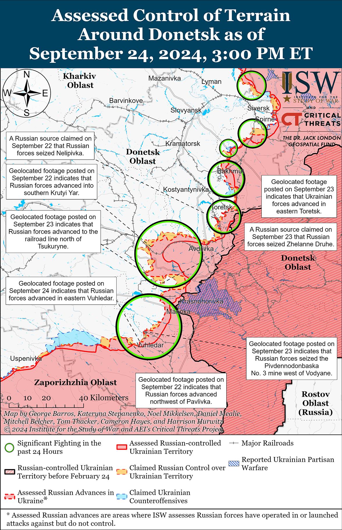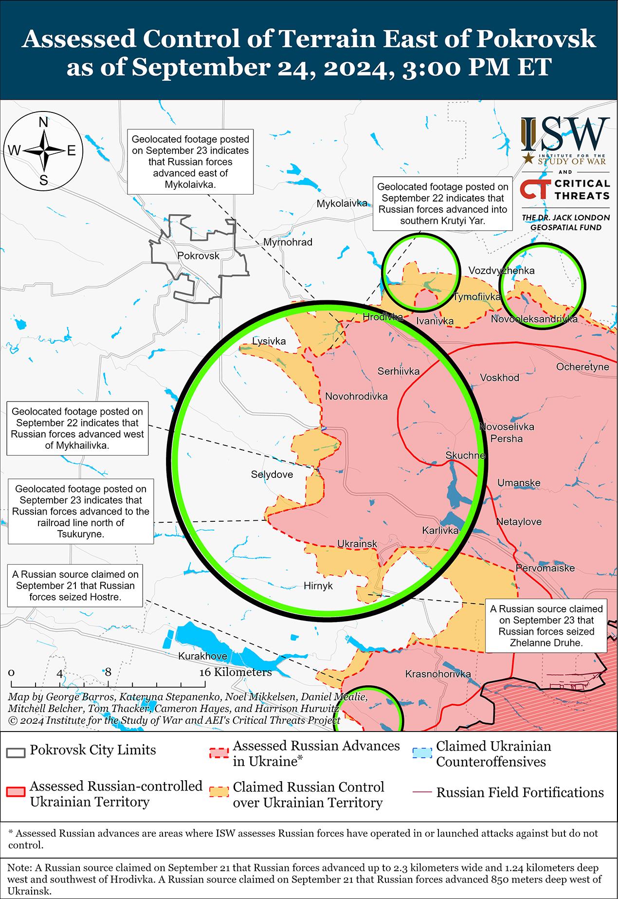 Сообщается, что российские войска продолжали продвигаться к востоку и юго-востоку от Покровска, хотя по состоянию на 24 сентября никаких подтвержденных изменений в линии фронта в этом районе не было. Российские военные блогеры утверждали, что российские войска продвинулись в полях к западу от Гродовки в сторону Николаевки (оба к востоку от Покровска); в восточном Селидово (юго-восточнее Покровска); к северо-западу и западу от Украинска в сторону Цукурино (юго-восточнее Селидово); и вокруг Желанного Второго (юго-восток от Украинска), хотя ISW пока не наблюдал подтверждения этих заявлений. [62] Генеральный штаб Украины сообщил, что российские войска вели наземные атаки к северо-востоку от Покровска в районе Зеленого Поля; к востоку от Покровска в районе Воздвиженки, Миролюбовки и Новоторецкого; и к юго-востоку от Покровска в районах Красного Яра, Новогродовки, Николаевки, Мариновки, Журавки, Цукурино, Желанного Второго и Украинска. [63] Сообщается, что подразделения российской 1-й Славянской мотострелковой бригады (51-я ОА, бывший 1-й АК Донецкой Народной Республики [ДНР]) действуют в российском тылу к юго-востоку от Покровска в районе Очеретино. [64]