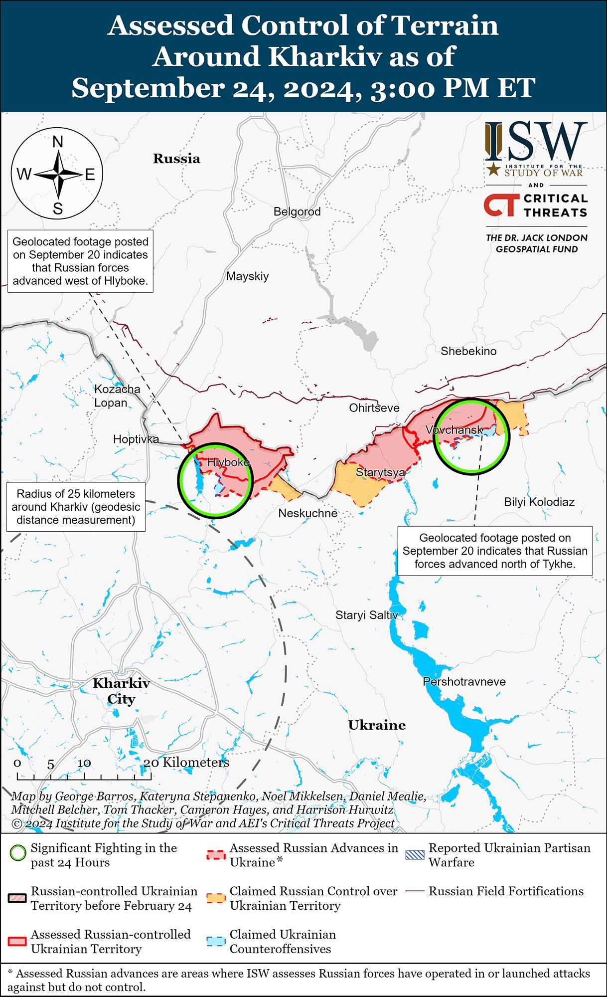 В последнее время украинские войска продвинулись в Глушковском районе к западу от Украинского выступа в Курской области на фоне продолжающихся наступательных действий в этом районе 24 сентября. На геолоцированных кадрах, опубликованных 23 сентября, видно, что украинские войска продвинулись в ходе механизированной атаки к юго-востоку от Веселого (к юго-западу от Глушково), а российские военные блогеры также утверждали, что украинские войска провели механизированную атаку и продвинулись в этом районе. [38] На дополнительных геолоцированных кадрах, опубликованных 20 сентября, видно, что украинские войска также недавно продвинулись в полях к востоку от Веселого. [39] Российские источники, в том числе Минобороны РФ, утверждали, что 23 и 24 сентября российские войска отразили украинские атаки в направлении Нового Пути и Медвежьего (оба к югу от Глушково). [40]