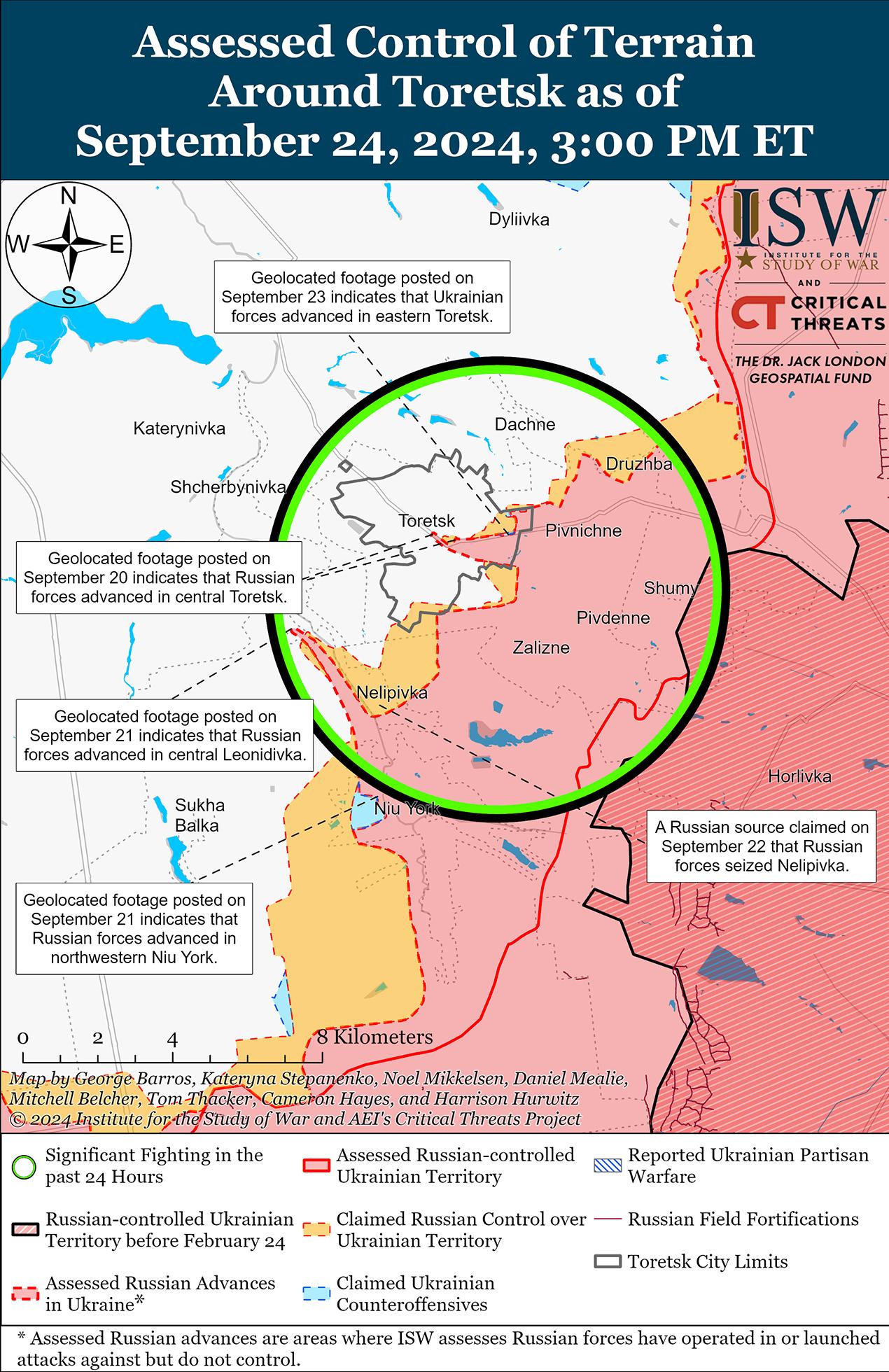 Украинские войска недавно восстановили ограниченные позиции в Торецке на фоне продолжающихся российских наступательных действий в этом районе 24 сентября. Геолоцированные кадры, опубликованные 23 сентября, указывают на то, что украинские войска продвинулись на юг вдоль улицы Центральной в восточной части Торецка. [58] Российский военный блогер утверждал, что российские войска продвинулись в восточной части Торецка и к югу от Торецка в Нелиповку и Леонидовку. [59] Военный блогер утверждал, что российские войска полностью вытеснили украинские войска из Нелиповки и зачищают населенный пункт, хотя ISW пока не зафиксировал подтверждения действий российских войск на севере Нелиповки. [60] Генеральный штаб Украины сообщал, что российские войска проводили наземные атаки в районе самого Торецка; северо-восточнее Торецка в районе Дачного; южнее Торецка в районе Нелиповки; и в направлении Щербиновки (западнее Торецка). [61]