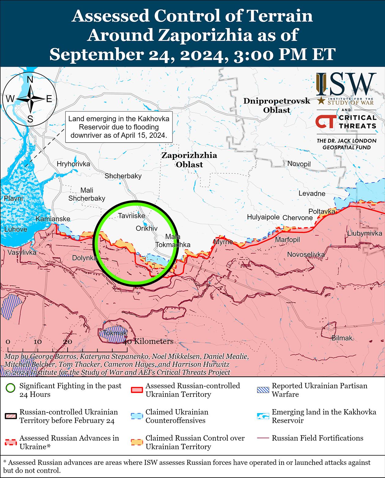 23 и 24 сентября на западе Запорожской области в районе Новоандреевка (северо-западнее Работино) продолжались позиционные бои, однако подтвержденных изменений на линии фронта не было. [66] Сообщается, что на запорожском направлении действуют подразделения российского отряда БАРС-11 «Кубань» (Боевой Армейский Резерв Страны) и части североосетинского батальона «Алания» (Добровольческий корпус России). [67]