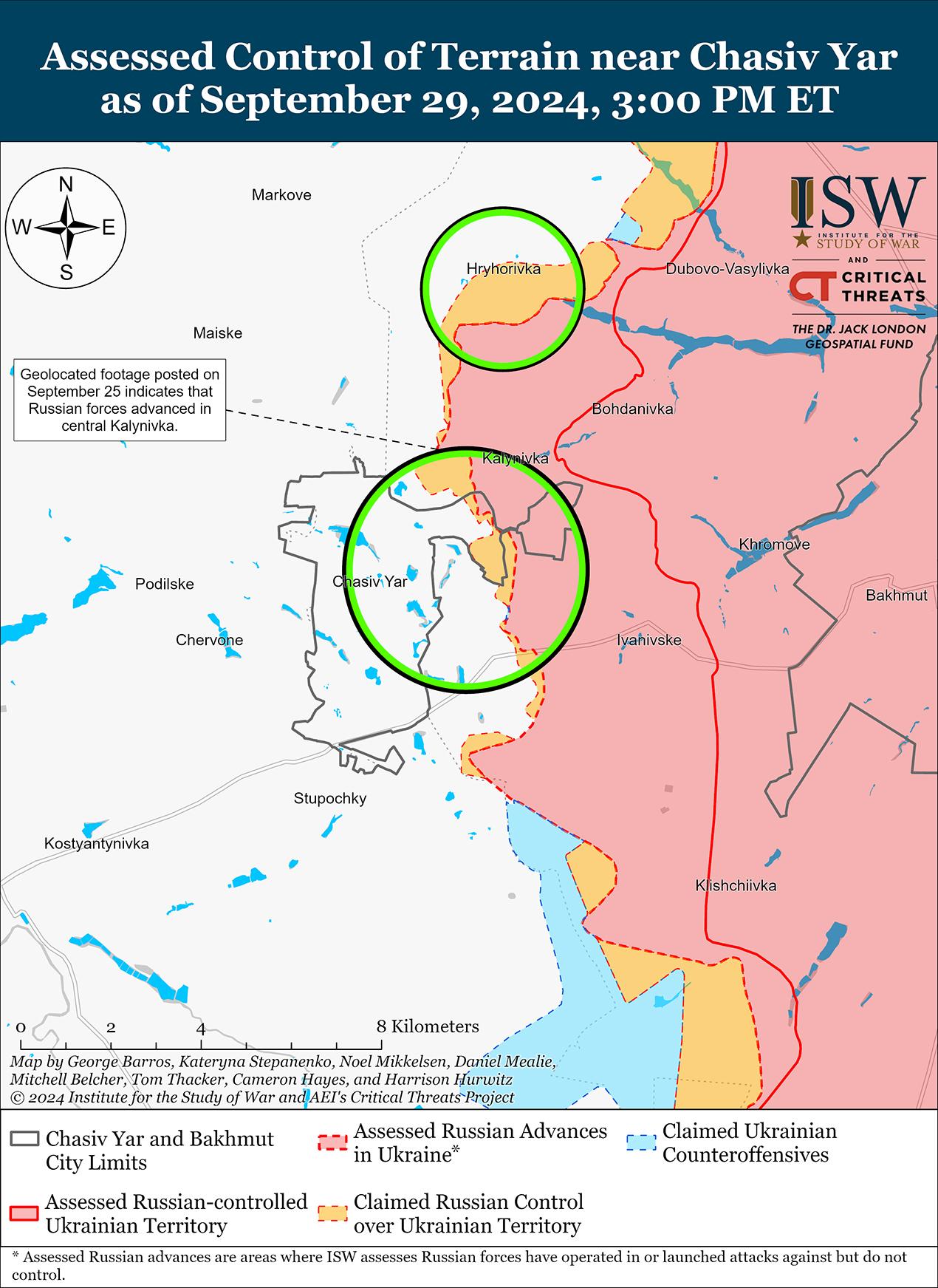 Российские войска продвинулись к юго-востоку от Покровска на фоне продолжающихся атак в этом районе 29 сентября. Геолоцированные кадры, опубликованные 29 сентября, указывают на то, что российские войска незначительно продвинулись в районе железнодорожной линии к югу от Селидово (к юго-востоку от Покровска) и продвинулись в южную часть Красного Яра и, вероятно, захватили оставшуюся часть Крутого Яра (как к юго-востоку от Покровска, так и к северу от Новогродовки). [37] 29 сентября российские военные блогеры заявили, что российские войска продвинулись дальше к югу от Селидово и к востоку и северо-западу от Цукурино (к юго-востоку от Покровска и Селидово), однако ISW не обнаружил подтверждения этих заявлений. [38] Российский военный блогер также заявил, что российские войска продолжают продвигаться к Покровску и пытаются окружить Селидово с нескольких направлений. [39] 28 и 29 сентября российские войска продолжили наступательные действия к востоку от Покровска в районе Воздвиженки, Миролюбовки, Новоторецкого, Николаевки и Гродовки и к юго-востоку от Покровска в районе Крутого Яра, Мариновки, Лысовки, Селидово и Цукурино. [40] Сообщается, что на Покровском направлении действуют подразделения российской 24-й бригады спецназа (Главное разведывательное управление Генерального штаба России [ГУР]). [41]