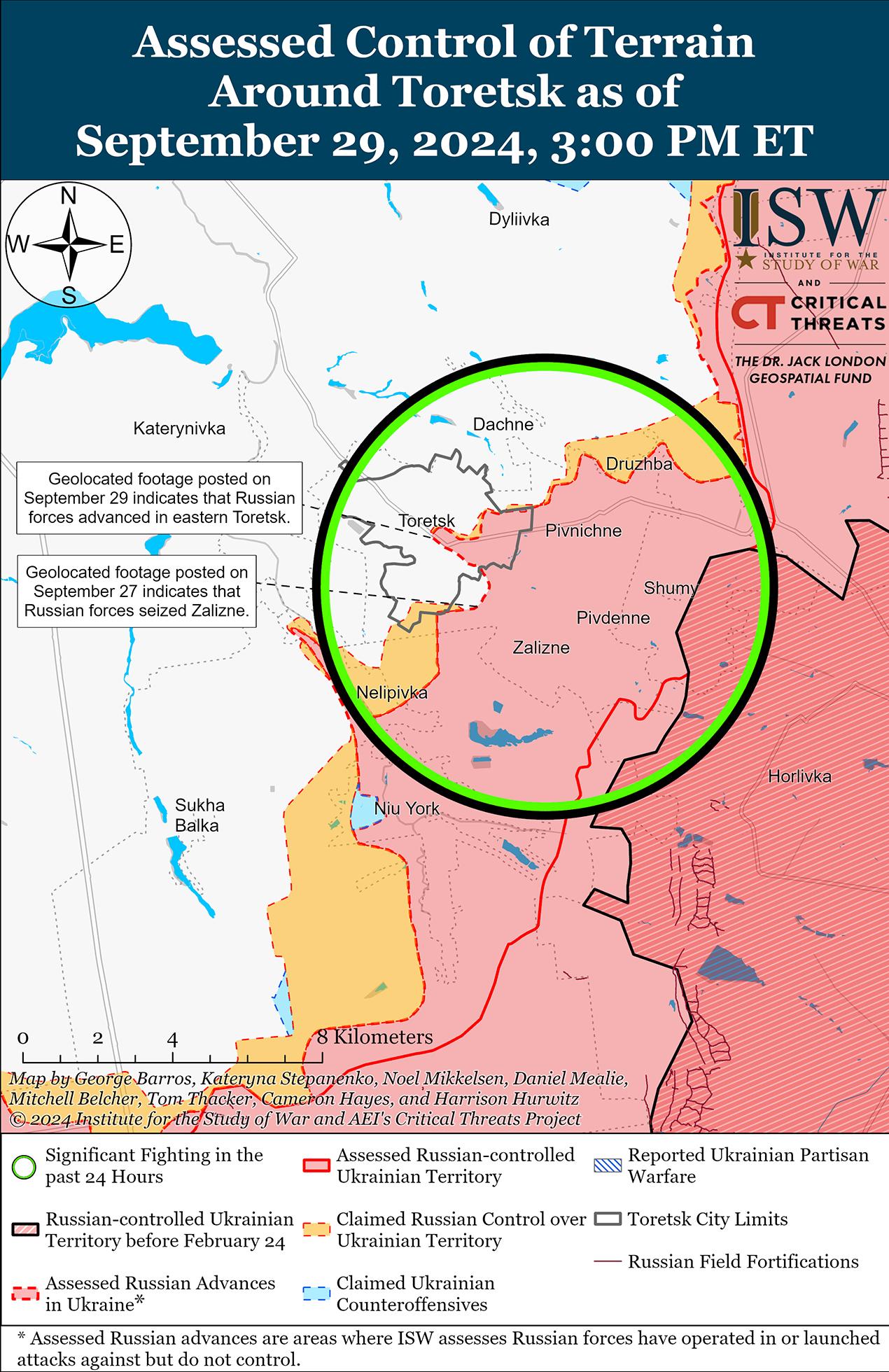 Российские войска недавно незначительно продвинулись в Торецке на фоне продолжающихся атак в этом районе 29 сентября. Геолоцированные кадры, опубликованные 29 сентября, указывают на то, что российские войска недавно продвинулись на запад вдоль улицы Дружбы в центре Торецка. [35] 28 и 29 сентября российские войска продолжали наступательные действия вблизи Торецка, к югу от Торецка в районе Нелиповки и к западу от Торецка в направлении Щербиновки. [36]