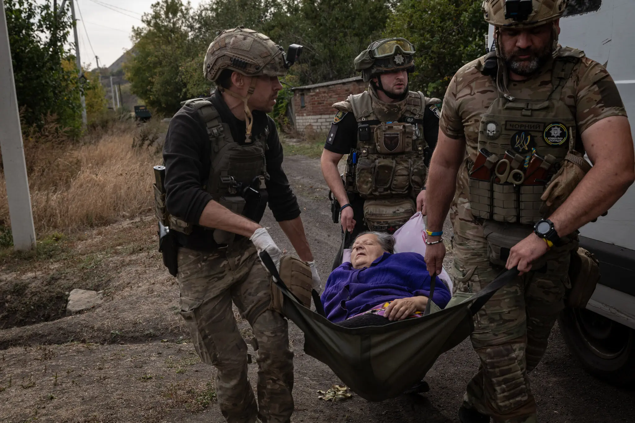 Члены «Белых ангелов», эвакуационного подразделения, входящего в состав национальной полиции, несут женщину, перенесшую инсульт в селе Зоряное, Украина, в четверг. Фото…Николь Тунг для The New York Times